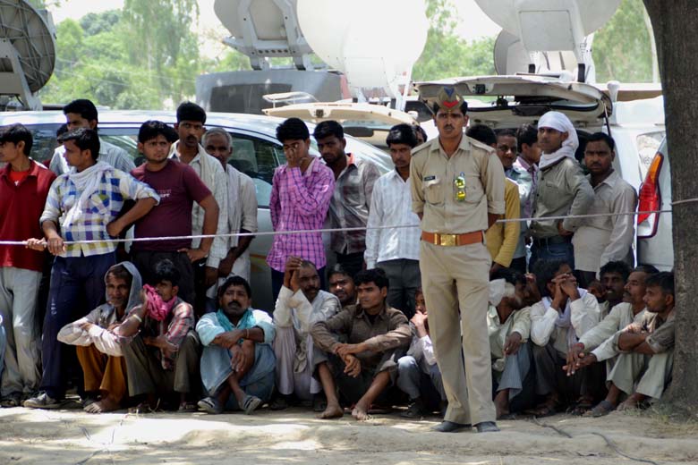 घटना स्थल पर जमा भीड़ और भीड़ को आगे बढ़ने से रोकने के लिए तैनात पुलिस कर्मी