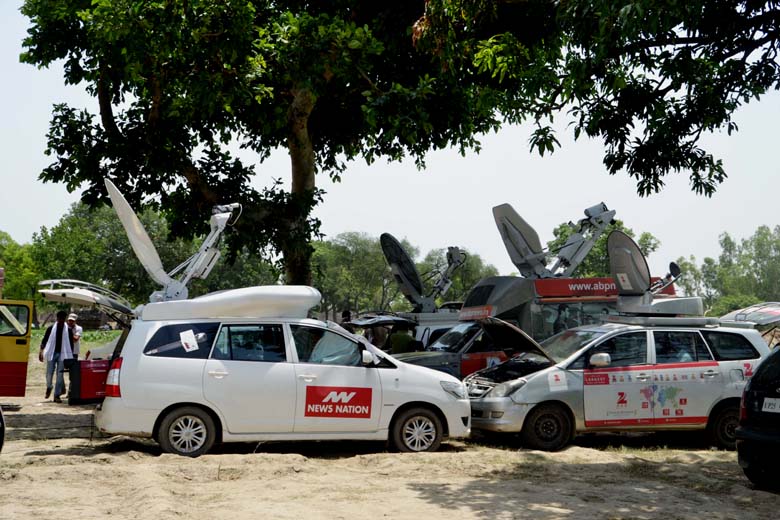 घटना की रिपोर्टिंग के लिए मौके पर मौजूद तमाम चैनलों की गाड़ियाँ