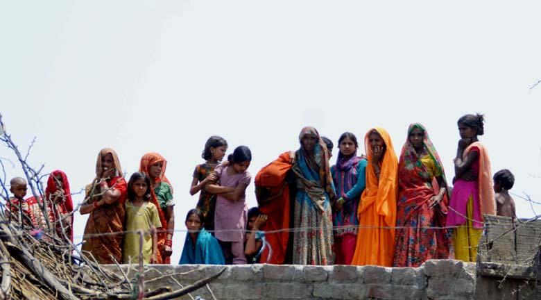 राहुल गाँधी को छत से निहारतीं महिलायें और बच्चे