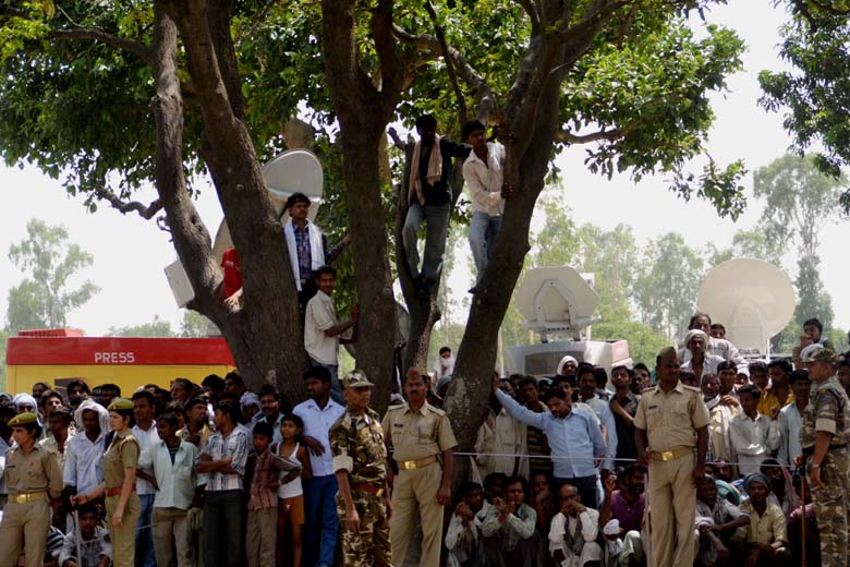 समूचे घटना क्रम को स्पष्ट देखने के लिए पेड़ पर चढ़े ग्रामीण