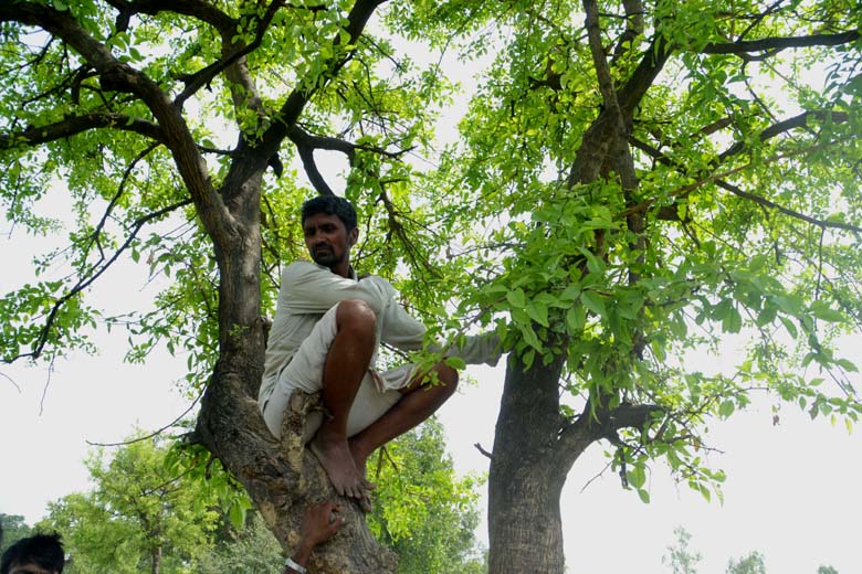 पेड़ पर आराम से बैठ कर घटना क्रम को देखता एक ग्रामीण
