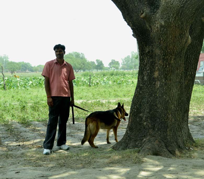 जासूसी कुत्ते के साथ खड़ा पुलिस कर्मी और गर्मी से बेहाल कुत्ता