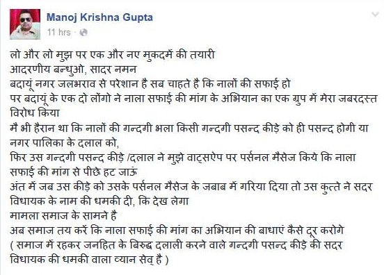 सूत्रों का यह भी कहना है कि कागजों में शहर के नाले साफ हो गये हैं, लेकिन वास्तव में नाले साफ नहीं कराये गये हैं। नालों की सफाई न कराने का मुददा व्यापारी नेता मनोज कृष्ण गुप्ता ने उठाया, तो उनका कहना है कि उन्हें धमकाया जा रहा है। किसी ने उन्हें सदर विधायक आबिद रजा की शक्ति का हवाला देते हुए धमकाया है, जिसका खुलासा उन्होंने अपनी फेसबुक वॉल पर किया है।