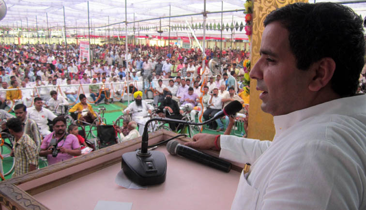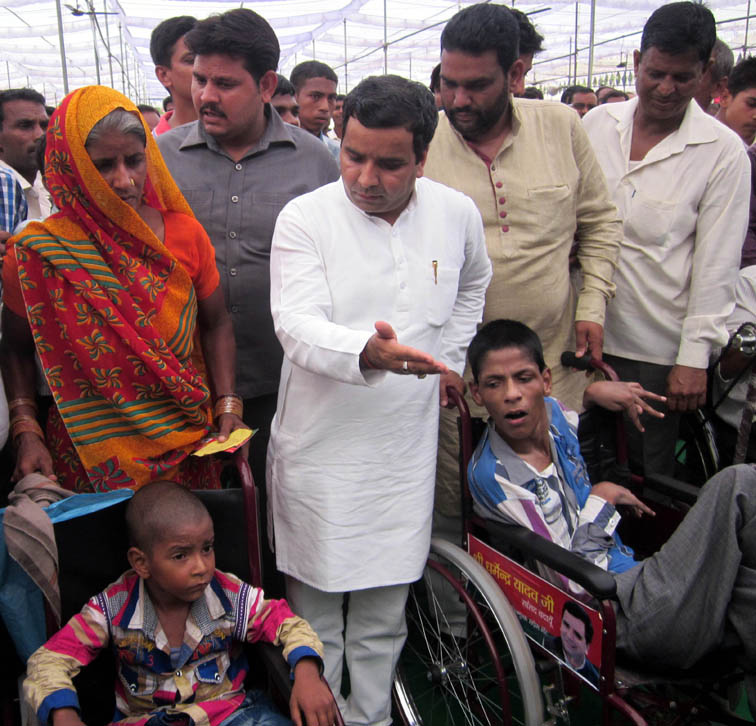 विकलांगजनों से बात करते सांसद धर्मेन्द्र यादव।