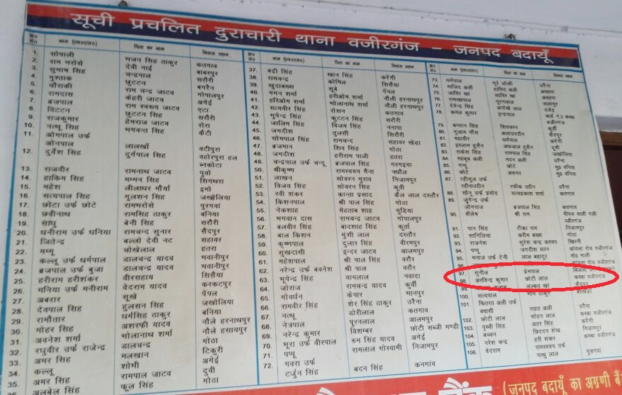 जी हाँ, थाना वजीरगंज में लटकी दुराचारियों की सूची में अरविंद वार्ष्णेय का नाम 98वें नंबर पर आज भी लिखा नजर आ रहा है, साथ ही इस पर पिछले दिनों सदर कोतवाली और थाना वजीरगंज में ही दो और मुकदमें दर्ज हुए हैं, लेकिन पुलिस कार्रवाई करने की जगह उल्टा इसकी चापलूसी करती नजर आती है। थाना वजीरगंज में इसके इशारे पर काम होता है। सूत्रों का कहना है कि किस के विरुद्ध मुकदमा दर्ज होना है और कौन जेल जाना है, इसका निर्णय अरविंद वार्ष्णेय करता है, जिससे पुलिस की बड़ी फजीहत हो रही है।