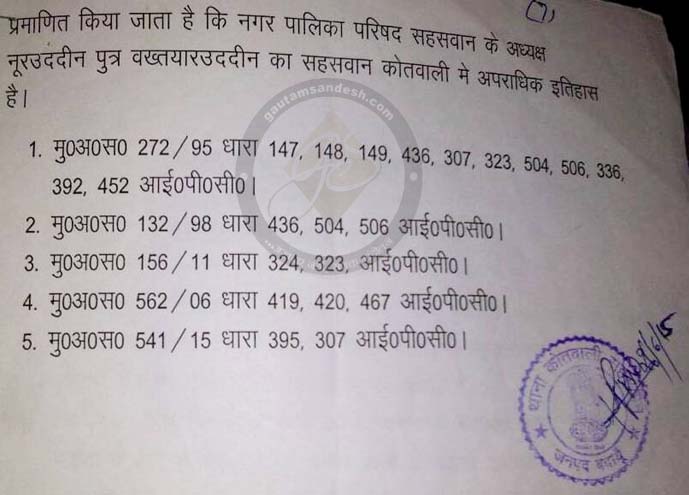 उल्लेखनीय है कि गौतम संदेश ने सहसवान में हुए शीतल प्याऊ घोटाला, सही सड़कों को उखड़वा कर उनके निर्माण के नाम पर घोटाला और सफाई का फर्जी टेंडर निकालने के घोटाले का खुलासा किया था, इस सबमें अधिशासी अधिकारी संजय तिवारी को चेयरमैन नूरुद्दीन का बराबर का सहभागी बताया जा रहा है। सहसवान नगर पालिका में भ्रष्टाचार को रोकने के उद्देश्य से अधिशासी अधिकारी अशोक गोयल को तैनात कर दिया गया है, इससे चेयरमैन नूरुद्दीन की मानसिक स्थिति गड़बड़ा गई है। चूँकि नूरुद्दीन ने गौतम संदेश पर सैकड़ों लोगों के सामने आरोप लगाया, तो गौतम संदेश ने छानबीन की। नूरुद्दीन पर कोतवाली सहसवान में ही गंभीर धाराओं के अंतर्गत मुकदमे दर्ज हो चुके हैं, जिनमें चोरी तक का मुकदमा दर्ज है।