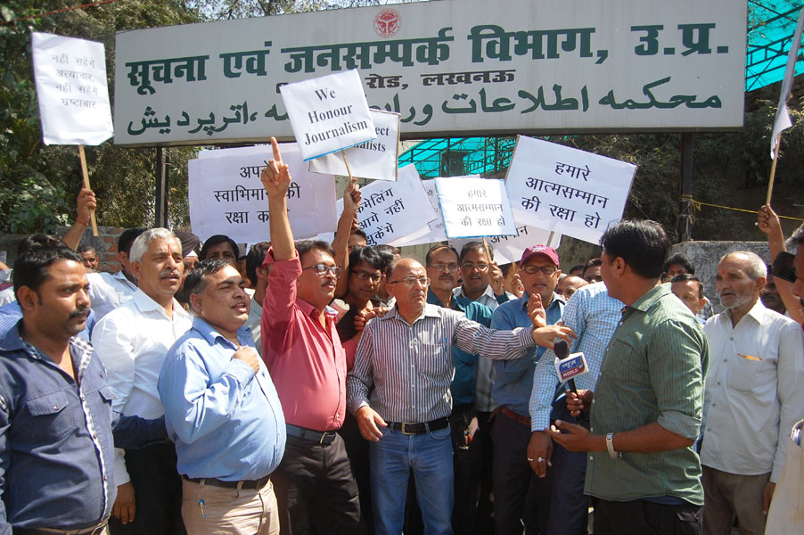 लखनऊ में एनेक्सी के मुख्य द्वार पर सूचना विभाग के समस्त अधिकारियों और कर्मचारियों ने आज एक अखबार के विरुद्ध जोरदार प्रदर्शन किया। आरोप है कि पिछले कई माह से सूचना विभाग के अधिकारियों-कर्मचारियों के खिलाफ अनर्गल, तथ्यहीन, भ्रामक और अपमानजनक समाचार ’निष्पक्ष प्रतिदिन’ अखबार में छापे जा रहे हैं, इसके संपादक की गुंडागर्दी, धमकाने तथा वसूली करने की कोशिश के खिलाफ आज सूचना भवन में जबर्दस्त विरोध प्रदर्शन हुआ। प्रदर्शन के बाद सूचना विभाग के समस्त अधिकारियों और कर्मचारियों का जुलूस अखबार के खिलाफ नारेबाजी करता हुआ बापू भवन गया और मुख्यमंत्री को संबोधित ज्ञापन प्रमुख सचिव, सूचना को देने का प्रयास किया, लेकिन प्रमुख सचिव, सूचना के उपलब्ध न होने के कारण बापू भवन के दोनों गेटों पर प्रदर्शन कर एनेक्सी के मुख्य द्वार पर अखबार की प्रतियां जलाकर भर्त्सना की गई।