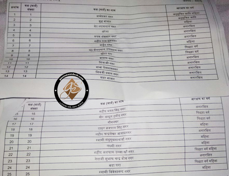 बदायूं नगर पालिका परिषद के साथ जिले की अन्य कई नगर पालिका और नगर पंचायतों के वार्ड के आरक्षण की शासन द्वारा फाइनल की गई सूची गौतम संदेश के पास है। संभावित प्रत्याशी अपने वार्डों के आरक्षण की स्थिति जानने को काफी समय से उत्सुक थे, जो अब चुनाव लड़ने की तैयारियां तेज कर सकते हैं।