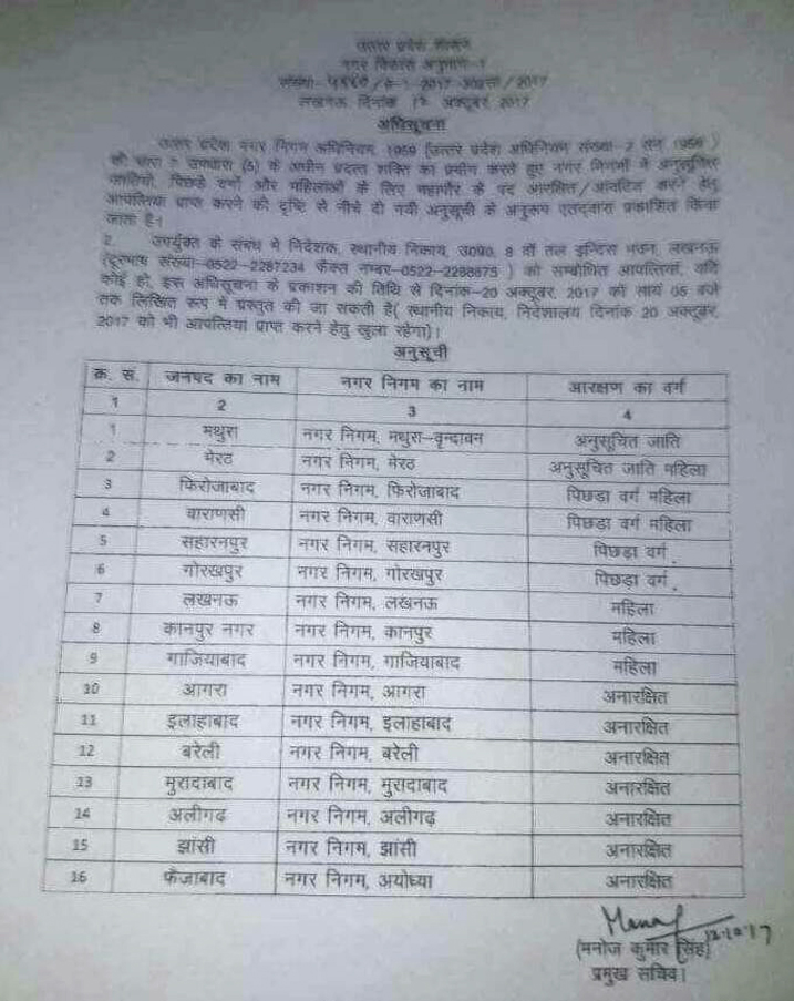 बरेली मंडल में शाहजहाँपुर नगर पालिका परिषद का दायित्व महिला के लिए आरक्षित किया गया है, वहीं पीलीभीत में पिछड़े वर्ग की महिला को चुना जायेगा, साथ ही लखीमपुर खीरी महिला वर्ग के लिए आरक्षित किया गया है, वहीं नगर निगमों की बात करें, तो बरेली को अनारक्षित रखा गया है, इसी तरह मथुरा अनुसूचित जाति, मेरठ अनुसूचित जाति, फिरोजाबाद पिछड़ा वर्ग महिला, वाराणसी पिछड़ा वर्ग महिला, सहारनपुर पिछड़ा वर्ग, गोरखपुर पिछड़ा वर्ग, लखनऊ महिला, कानपुर महिला, गाजियाबाद महिला, आगरा, इलाहाबाद, मुरादाबाद, अलीगढ़, झाँसी और फ़ैजाबाद को अनारक्षित रखा गया है।