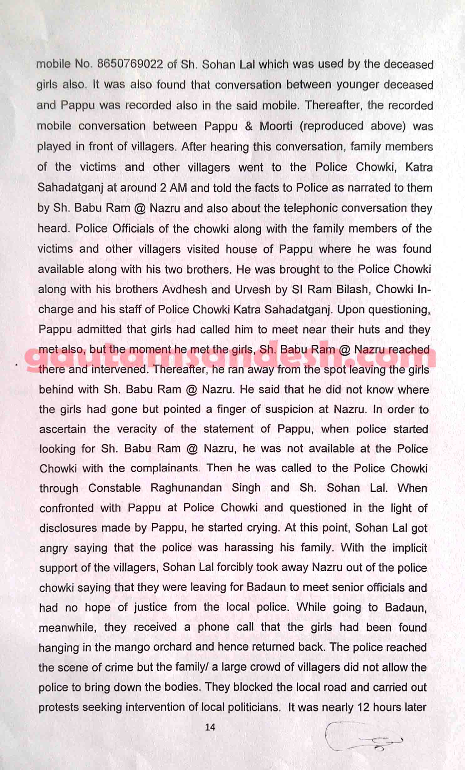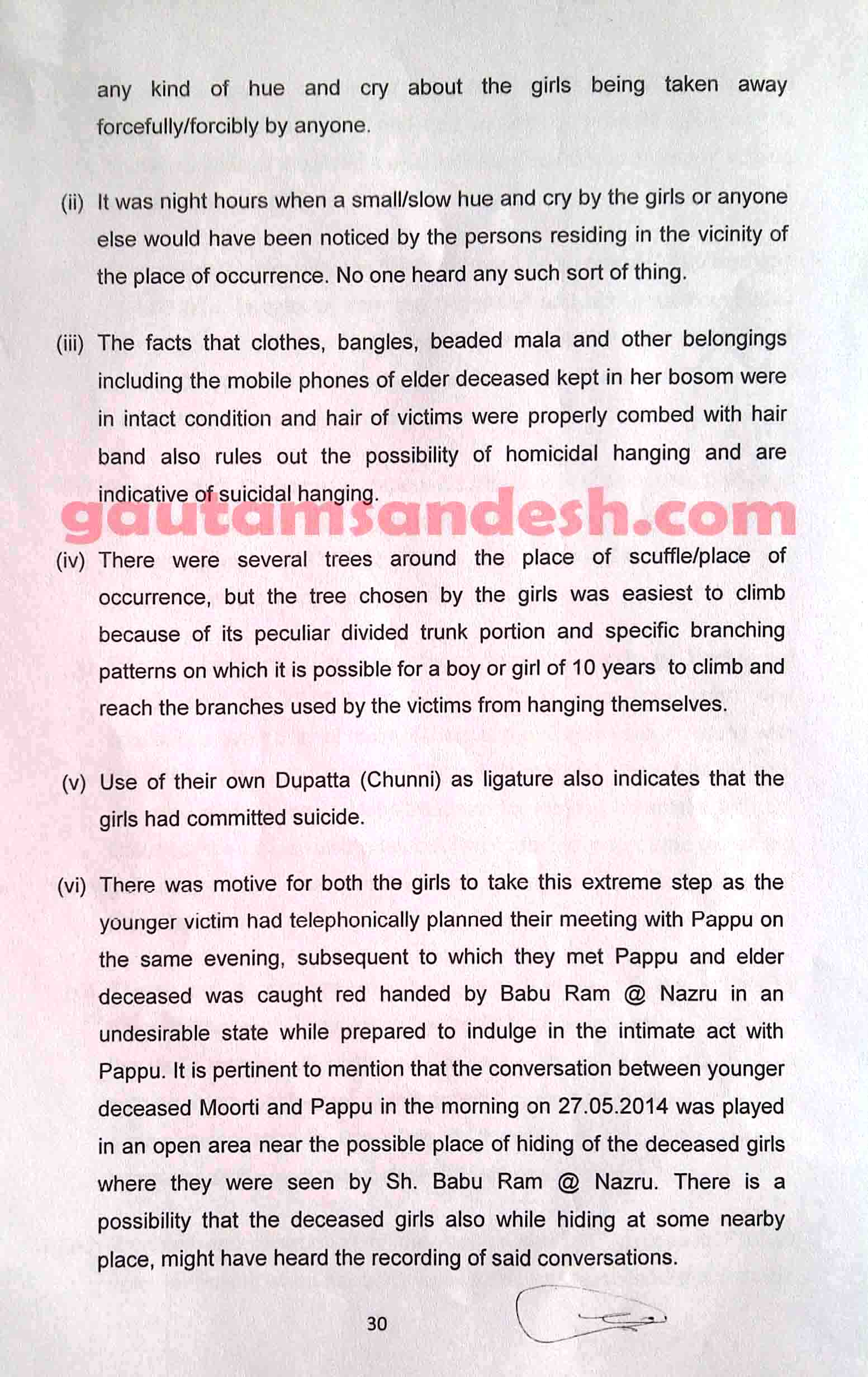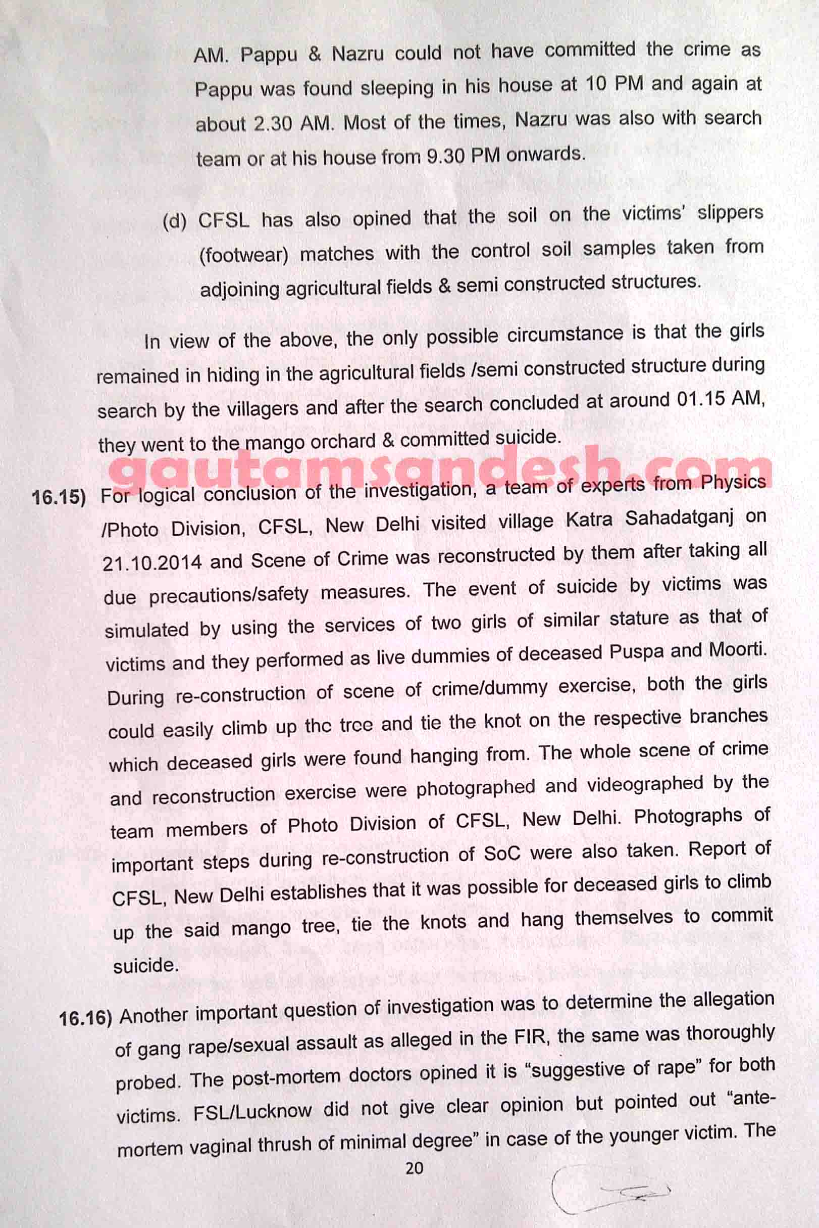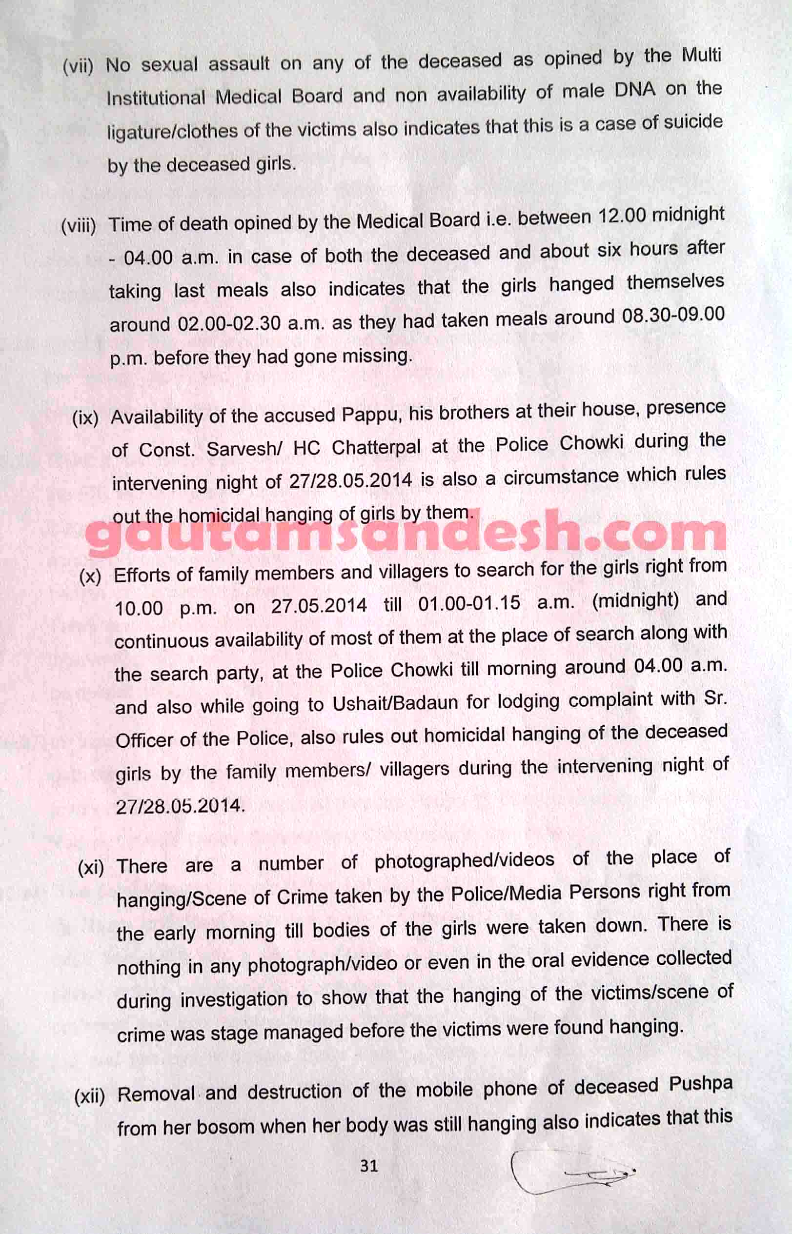 उत्तर प्रदेश के बदायूं जिले में स्थित उसहैत थाना क्षेत्र के गाँव कटरा सआदतगंज की चर्चित घटना में सीबीआई अपनी जाँच आख्या न्यायालय में 11 दिसंबर 2014 को दाखिल कर चुकी है। मीडिया से मिली खबरों के आधार पर सीबीआई की जांच पर मृतकाओं के परिजन सवाल खड़ा कर रहे हैं। न्यायालय ने सुनवाई की अगली तारीख 6 जनवरी 2015 निश्चित की है। मृतकाओं के परिजनों का पक्ष जानने के बाद न्यायालय सीबीआई की जाँच आख्या पर निर्णय करेगा। सीबीआई द्वारा दाखिल की गई जांच आख्या को लेकर अधिकांश लोग स्तब्ध हैं, इसलिए अब लोगों की नजरें न्यायालय की ओर टिक गई हैं कि न्यायालय रिपोर्ट पर क्या निर्णय लेगा।