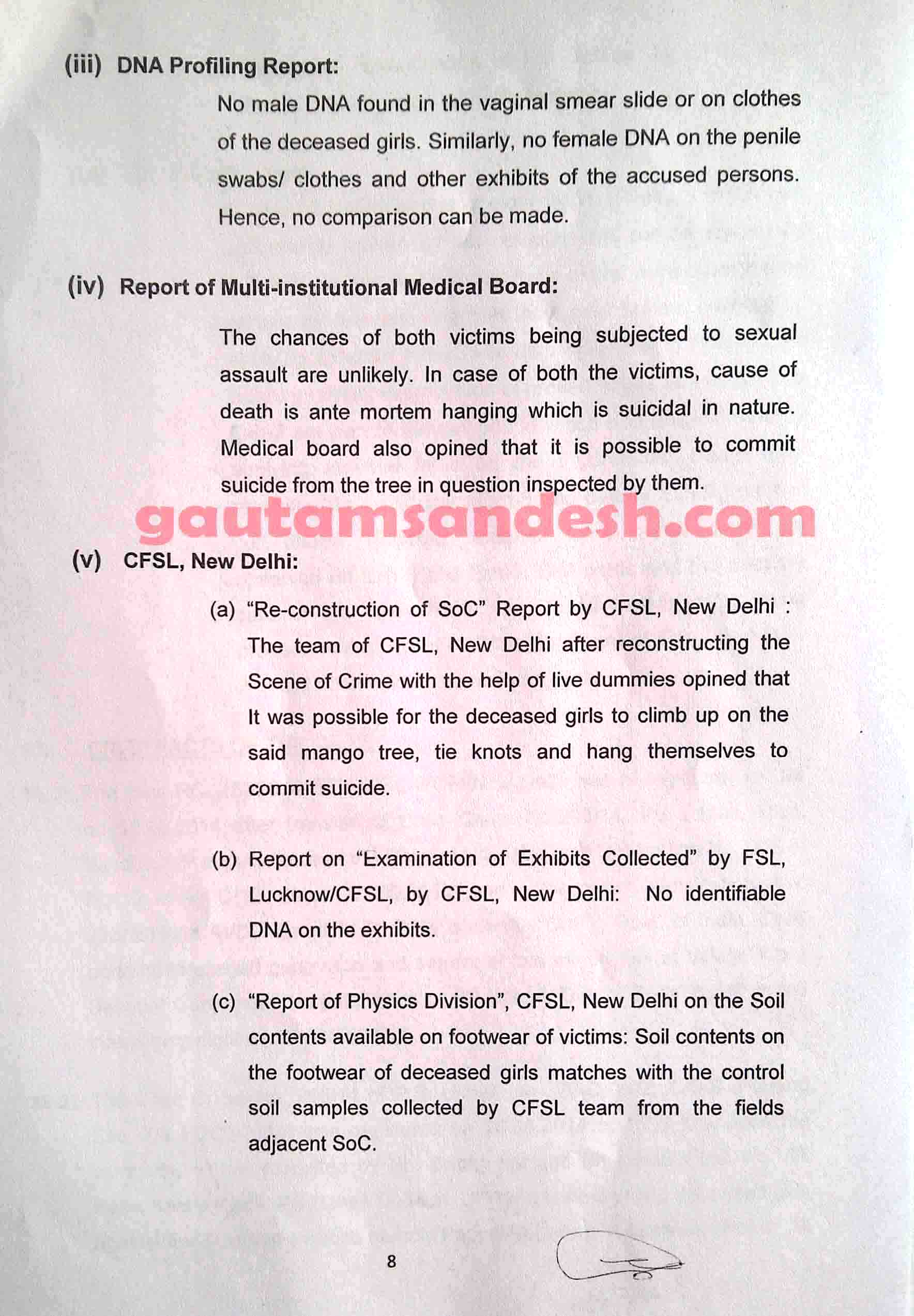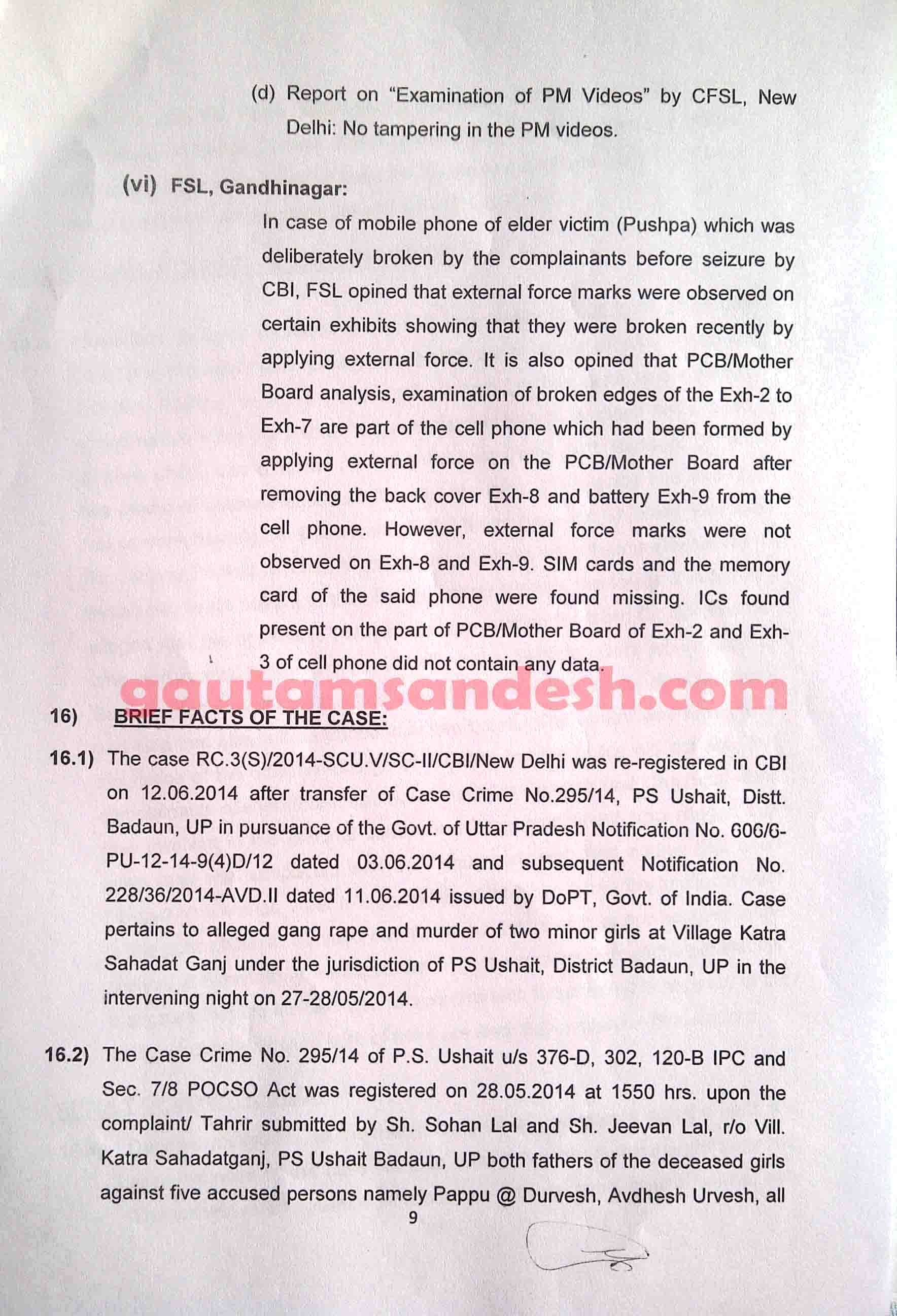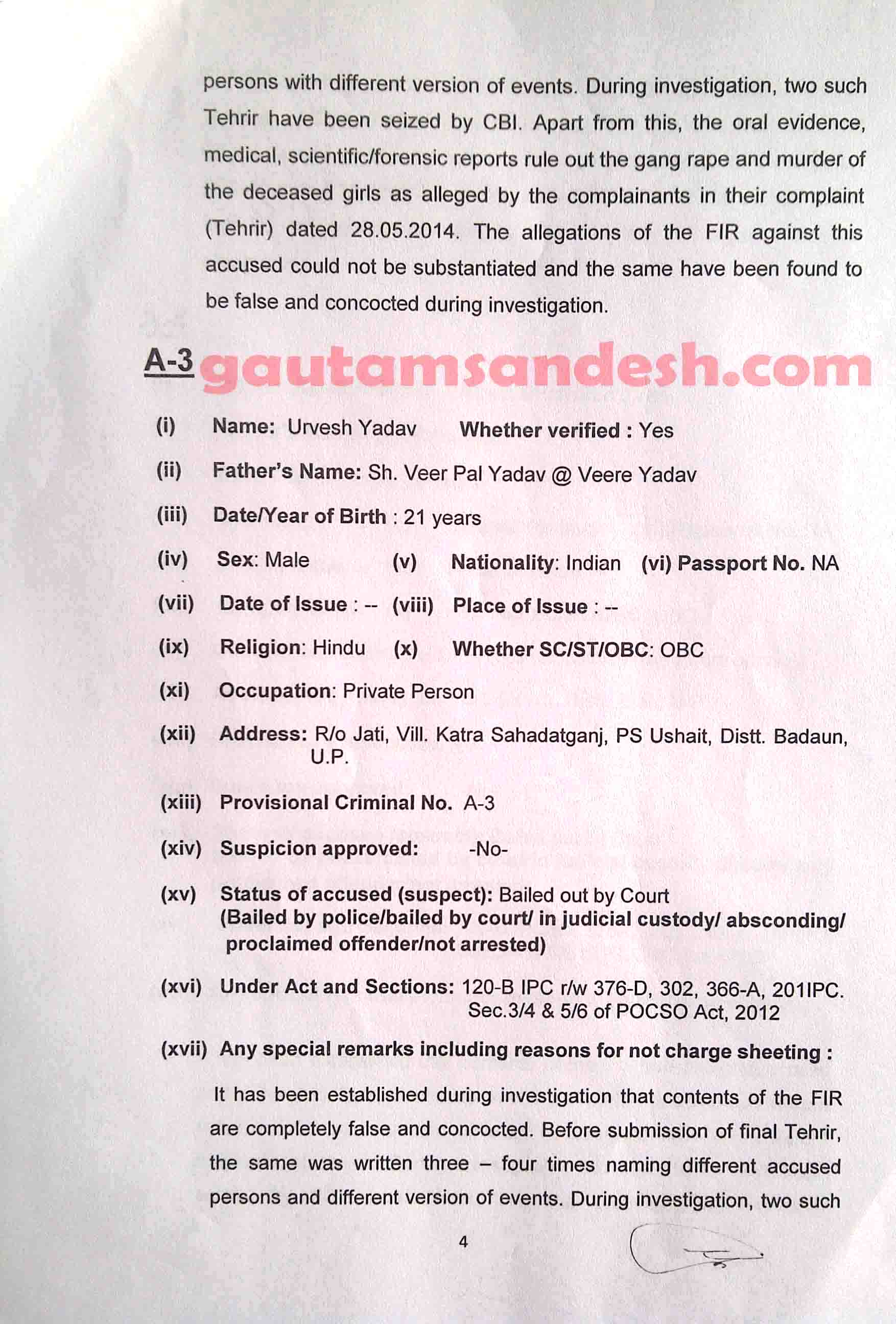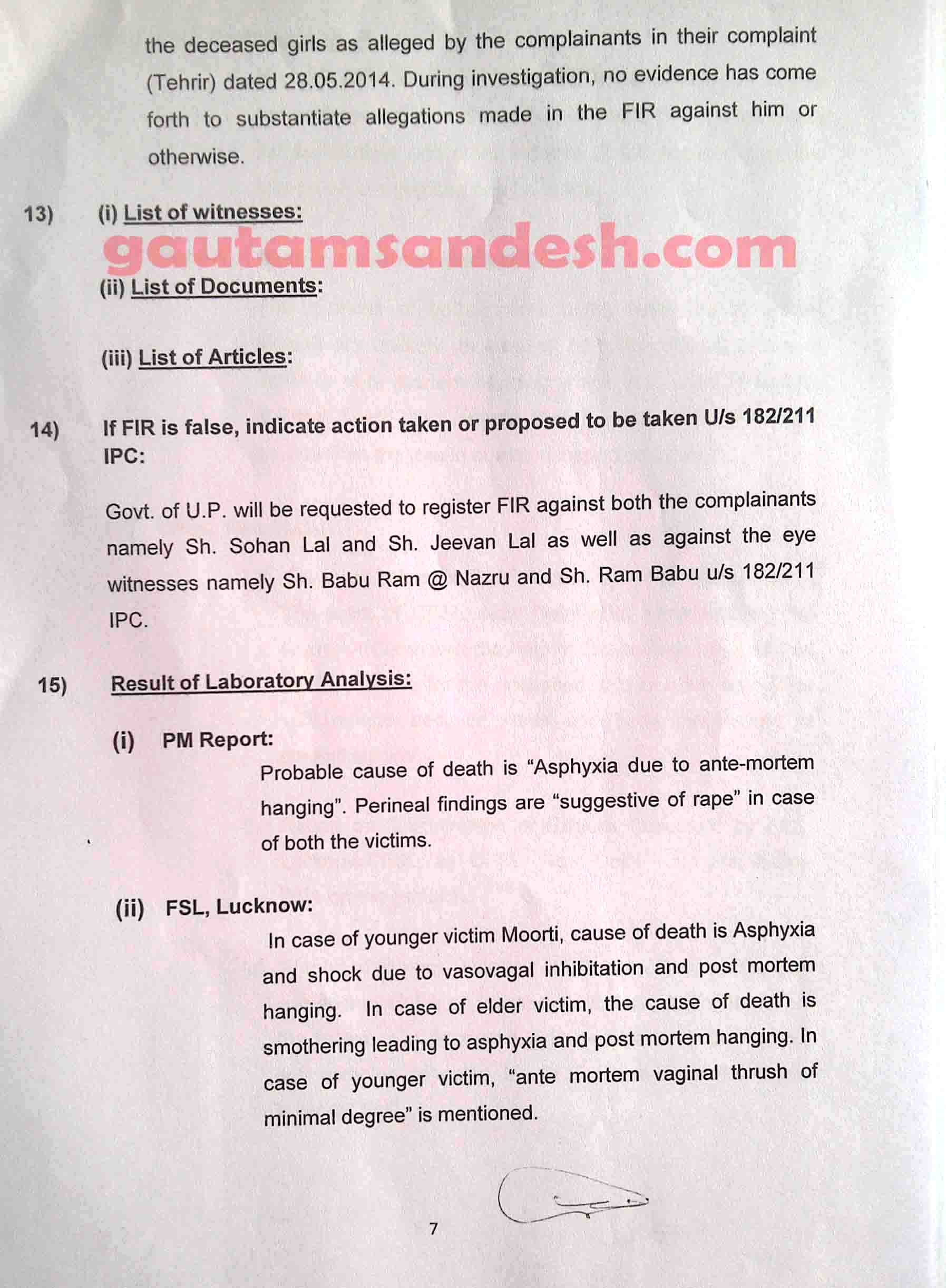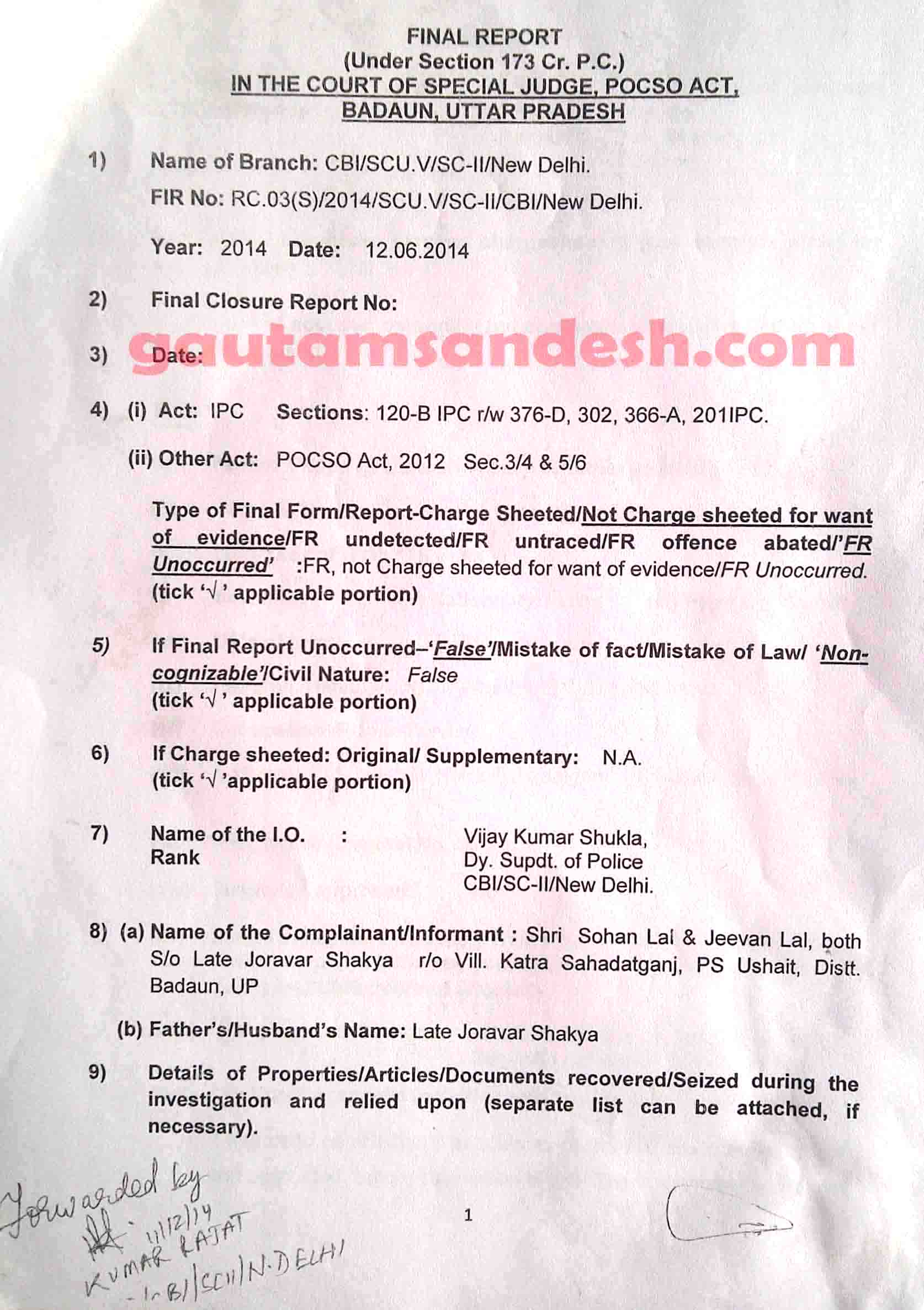 उत्तर प्रदेश के बदायूं जिले में स्थित उसहैत थाना क्षेत्र के गाँव कटरा सआदतगंज की चर्चित घटना में सीबीआई अपनी जाँच आख्या न्यायालय में 11 दिसंबर 2014 को दाखिल कर चुकी है। मीडिया से मिली खबरों के आधार पर सीबीआई की जांच पर मृतकाओं के परिजन सवाल खड़ा कर रहे हैं। न्यायालय ने सुनवाई की अगली तारीख 6 जनवरी 2015 निश्चित की है। मृतकाओं के परिजनों का पक्ष जानने के बाद न्यायालय सीबीआई की जाँच आख्या पर निर्णय करेगा। सीबीआई द्वारा दाखिल की गई जांच आख्या को लेकर अधिकांश लोग स्तब्ध हैं, इसलिए अब लोगों की नजरें न्यायालय की ओर टिक गई हैं कि न्यायालय रिपोर्ट पर क्या निर्णय लेगा।