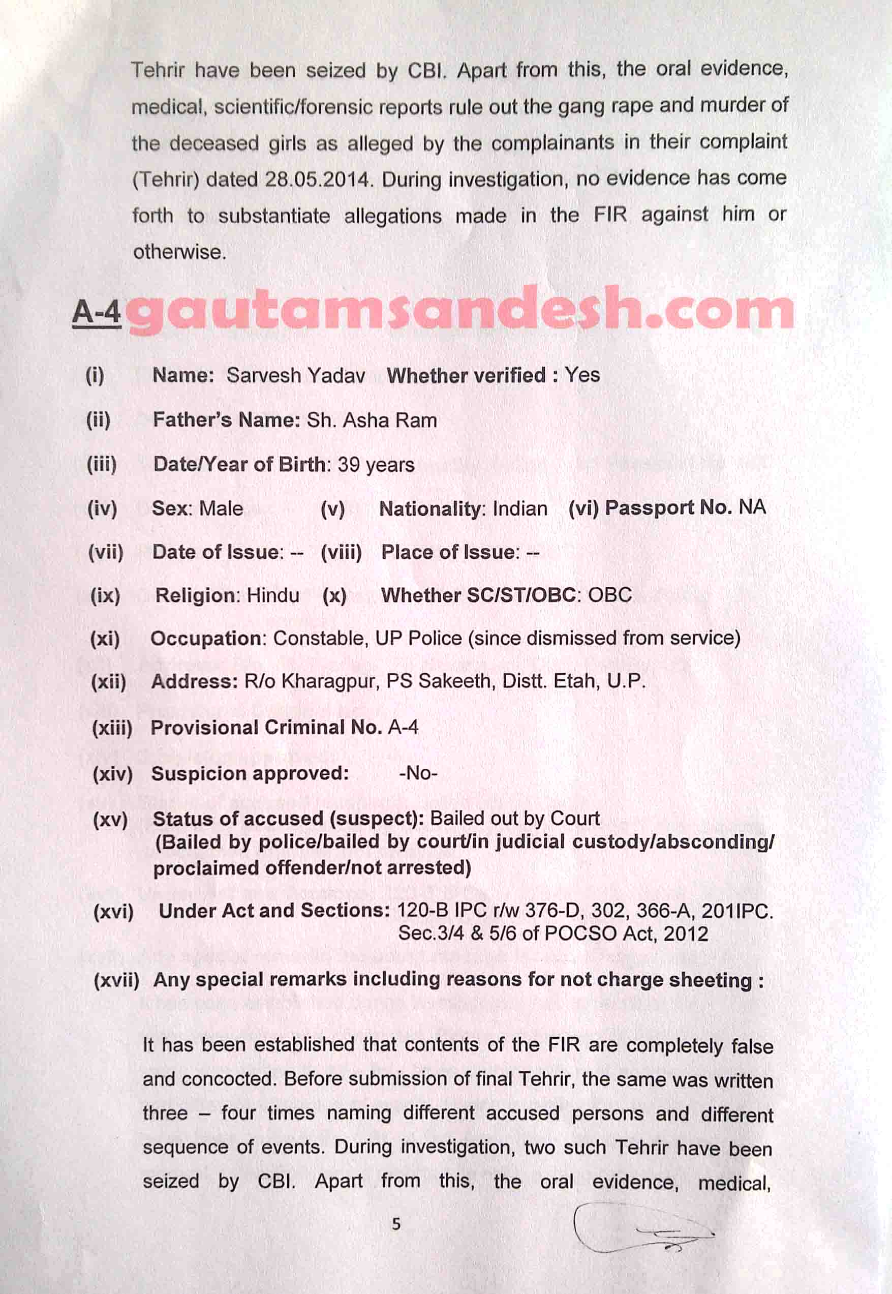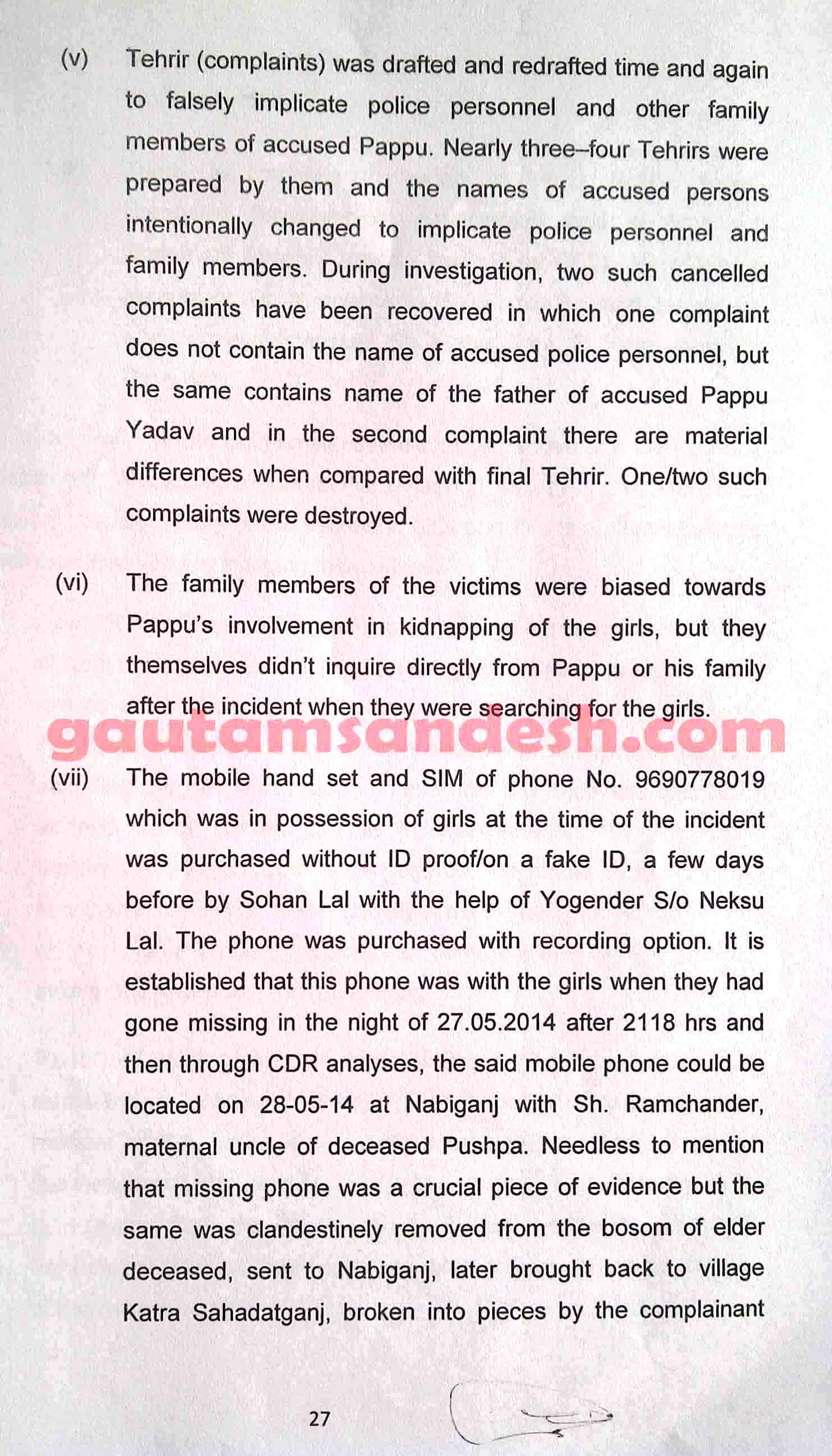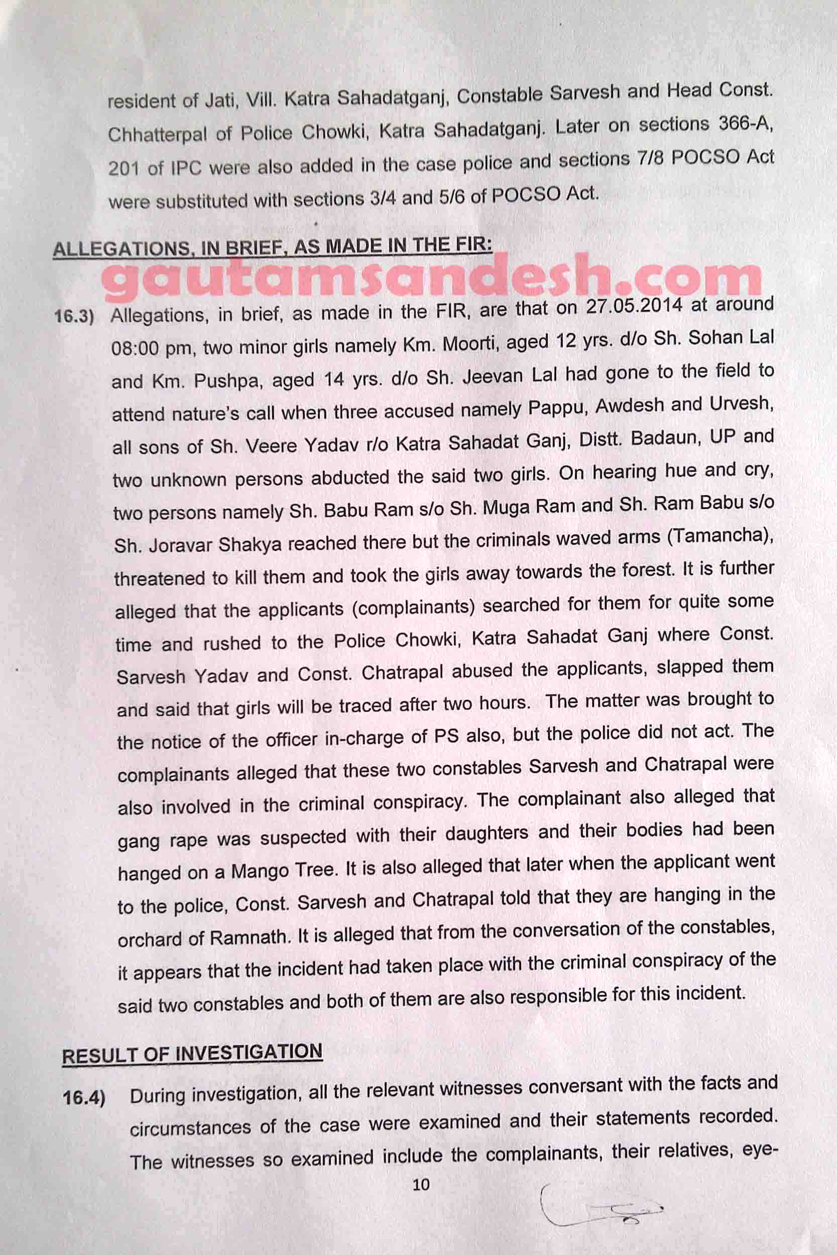 उल्लेखनीय है कि 22 मई 2014 की रात को कटरा सआदतगंज में ऐसी दर्दनाक घटना सामने लाई गई, जिसने उत्तर प्रदेश और भारत ही नहीं, बल्कि विश्व समुदाय का ध्यान अपनी ओर खींच लिया। संयुक्त राष्ट्र संघ ने भी घटना की निंदा की थी। एक मृतका के पिता द्वारा लिखाए गये मुकदमे में आरोप लगाया गया था कि उसकी बेटी व भतीजी को दुष्कर्म कर मार दिया गया और बाद में उनके शव आम के पेड़ पर लटका दिए गये, इस घटना में तीन सगे भाई पप्पू यादव, उर्वेश यादव, अवधेश यादव और दो सिपाही सर्वेश यादव व छत्रपाल गंगवार सहित पांच लोग नामजद कराये गये थे। पुलिस ने सभी आरोपियों को गिरफ्तार कर जेल भेज दिया था एवं सिपाही निलंबित कर दिए गये थे, इसके बावजूद पीड़ित परिजन संतुष्ट नहीं हुए, तो उनकी मांग पर यूपी सरकार ने 8 जून को सीबीआई जांच की संस्तुति कर दी थी, जिस पर केंद्र सरकार के अनुमोदन के बाद सीबीआई ने 12 जून को मुकदमा दर्ज कर जांच शुरू कर दी थी।