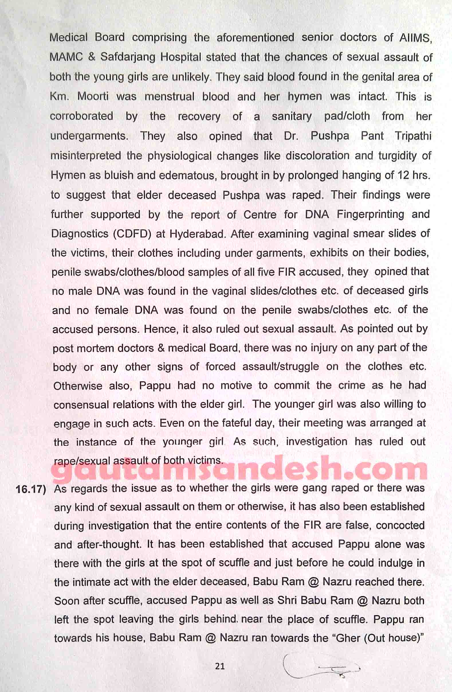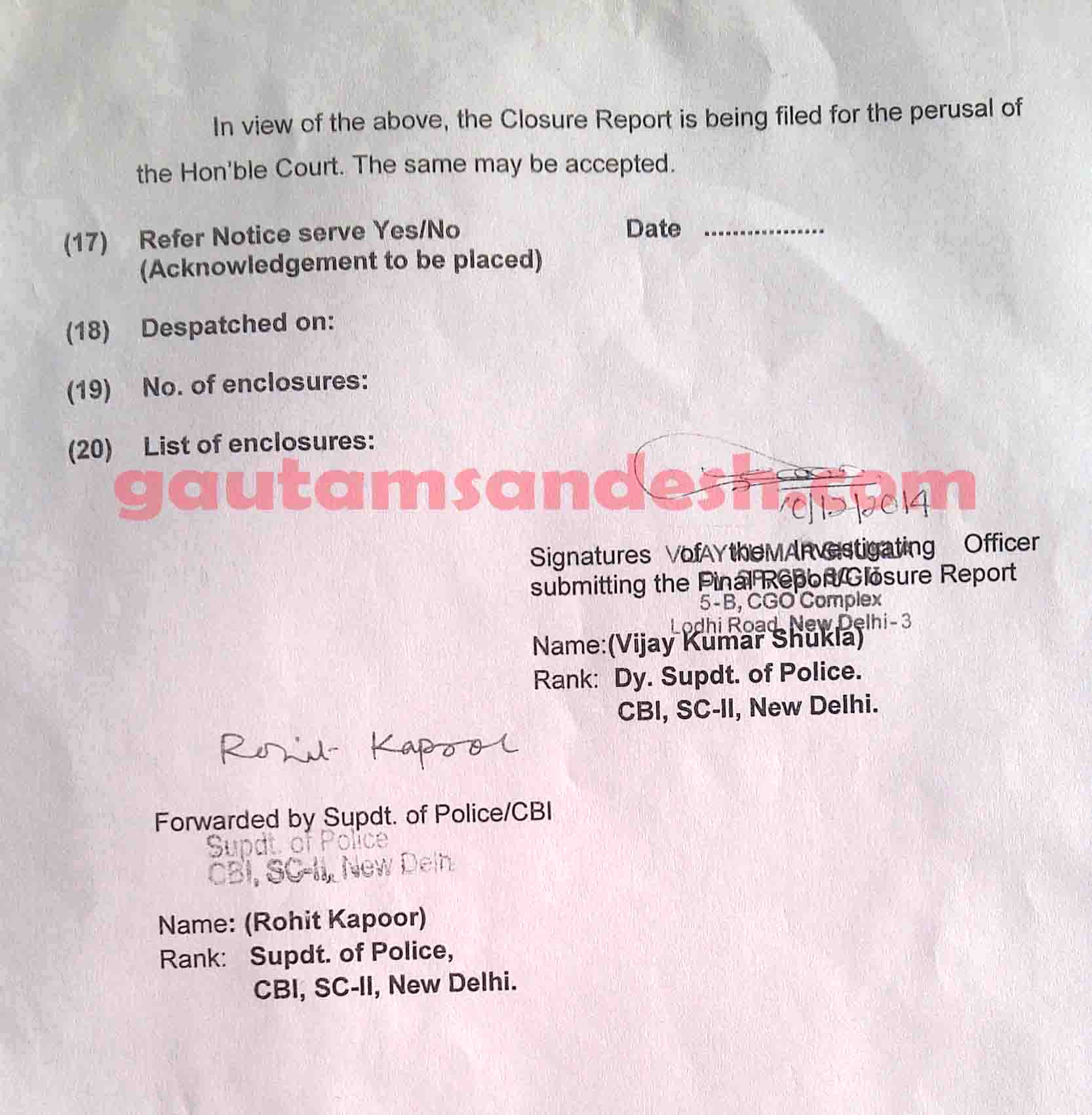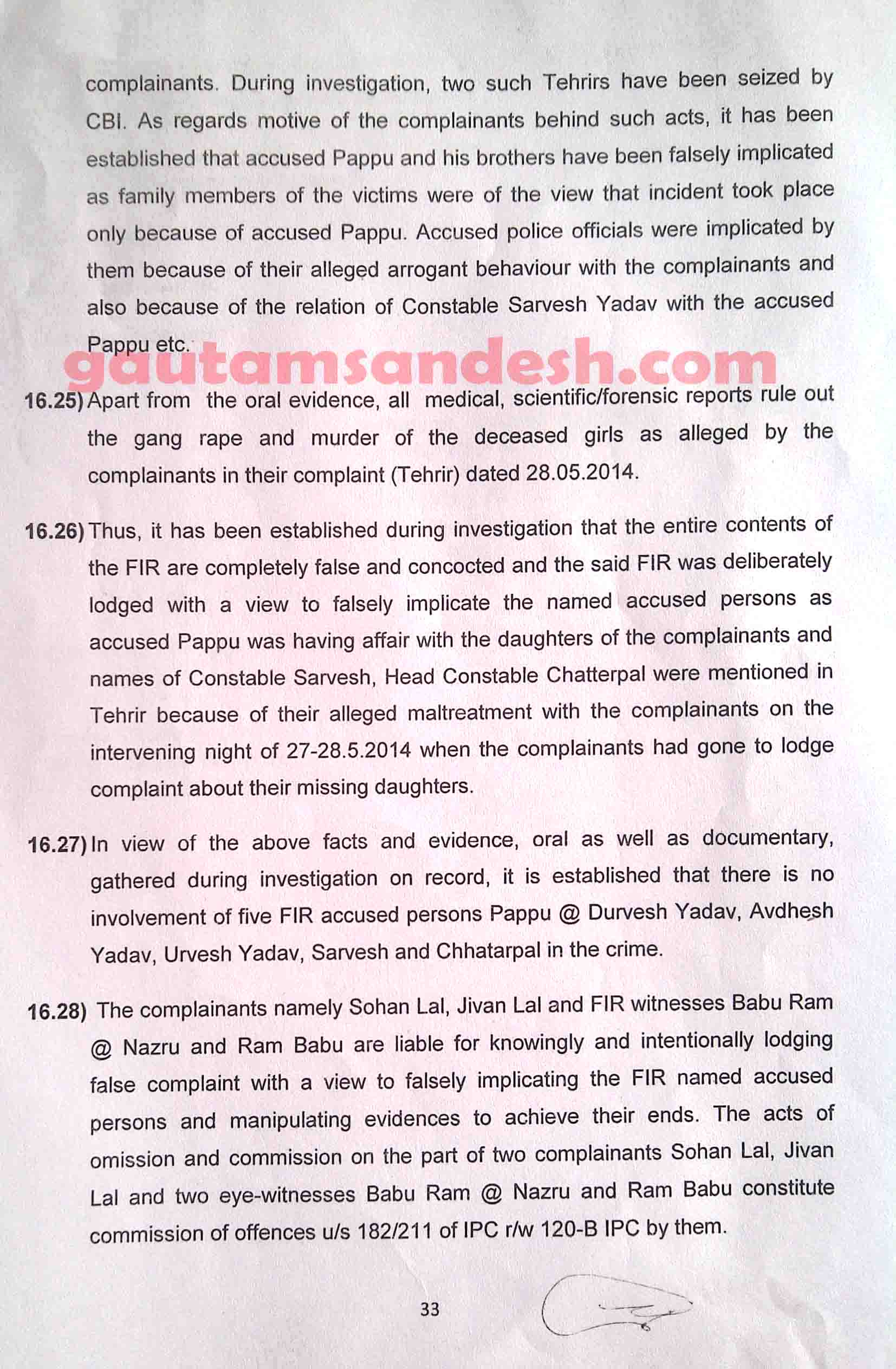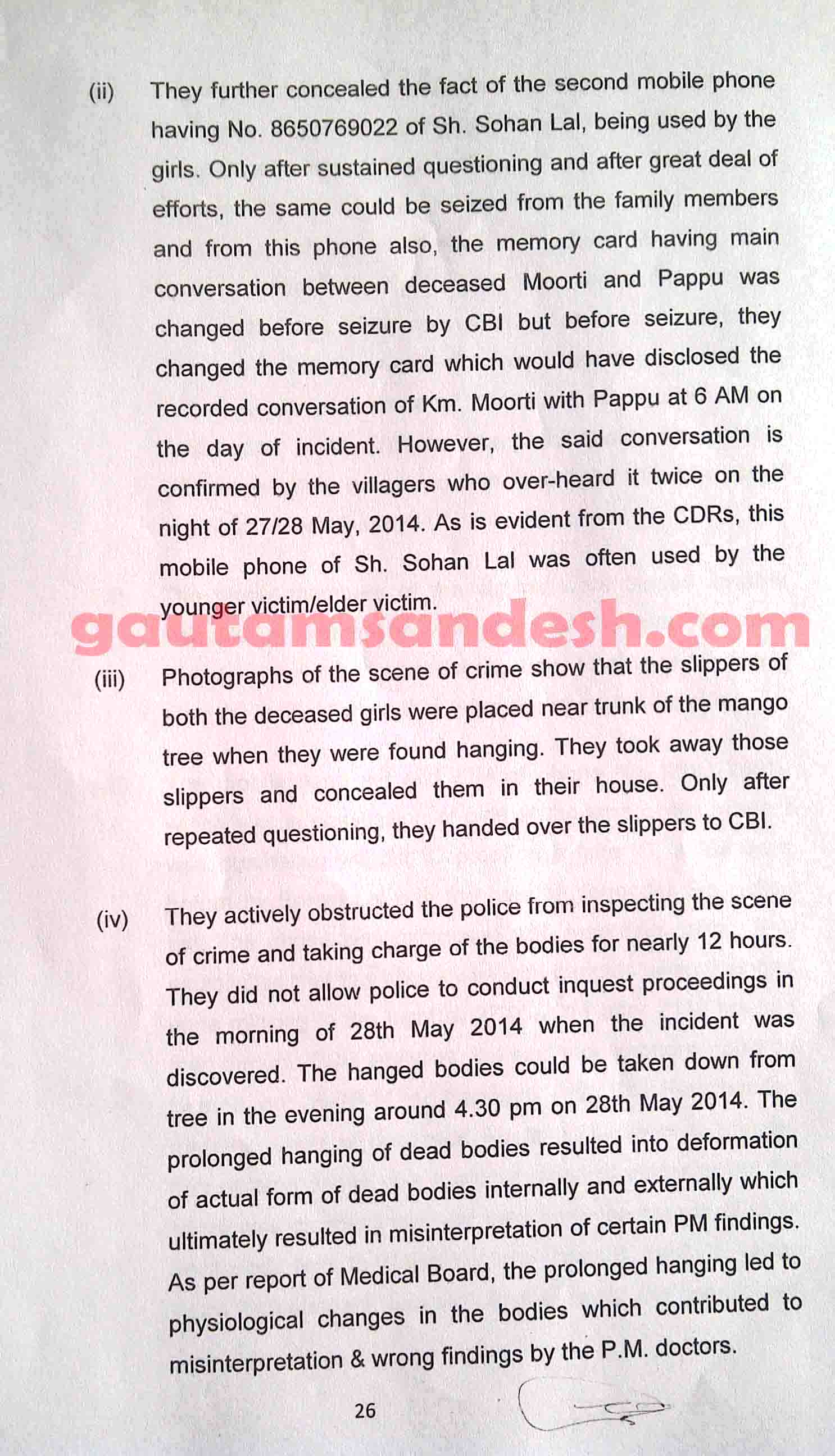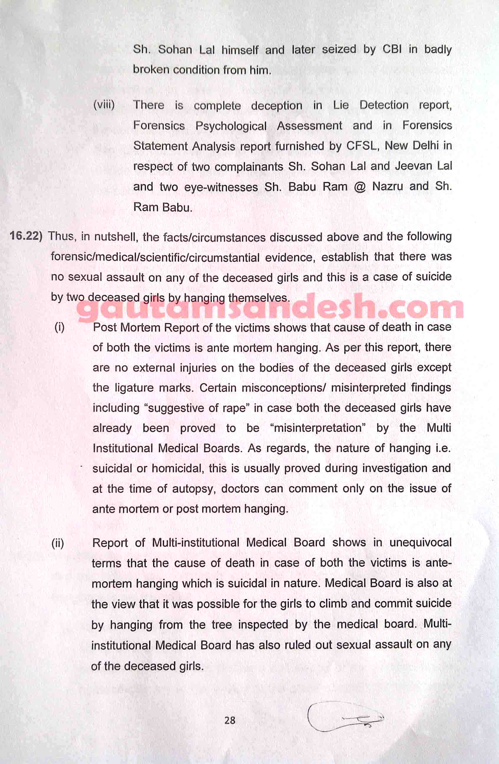 उक्त प्रकरण में तमाम उतार-चढ़ाव के बाद सीबीआई ने 11 दिसंबर 2014 को स्थानीय न्यायालय में अपनी जांच आख्या दाखिल कर दी है, जिस पर न्यायालय ने सुनवाई की तारीख 6 जनवरी 2015 निश्चित की है। मीडिया से मिली जानकारी के आधार पर मृतकाओं के परिजन सीबीआई की जाँच आख्या पर विरोध व्यक्त कर चुके हैं। हालाँकि अभी उन्हें जांच आख्या की प्रति नहीं मिली है। न्यायालय में सीबीआई ने 33 पेज की जाँच आख्या दाखिल की है, जो निम्नलिखित है।