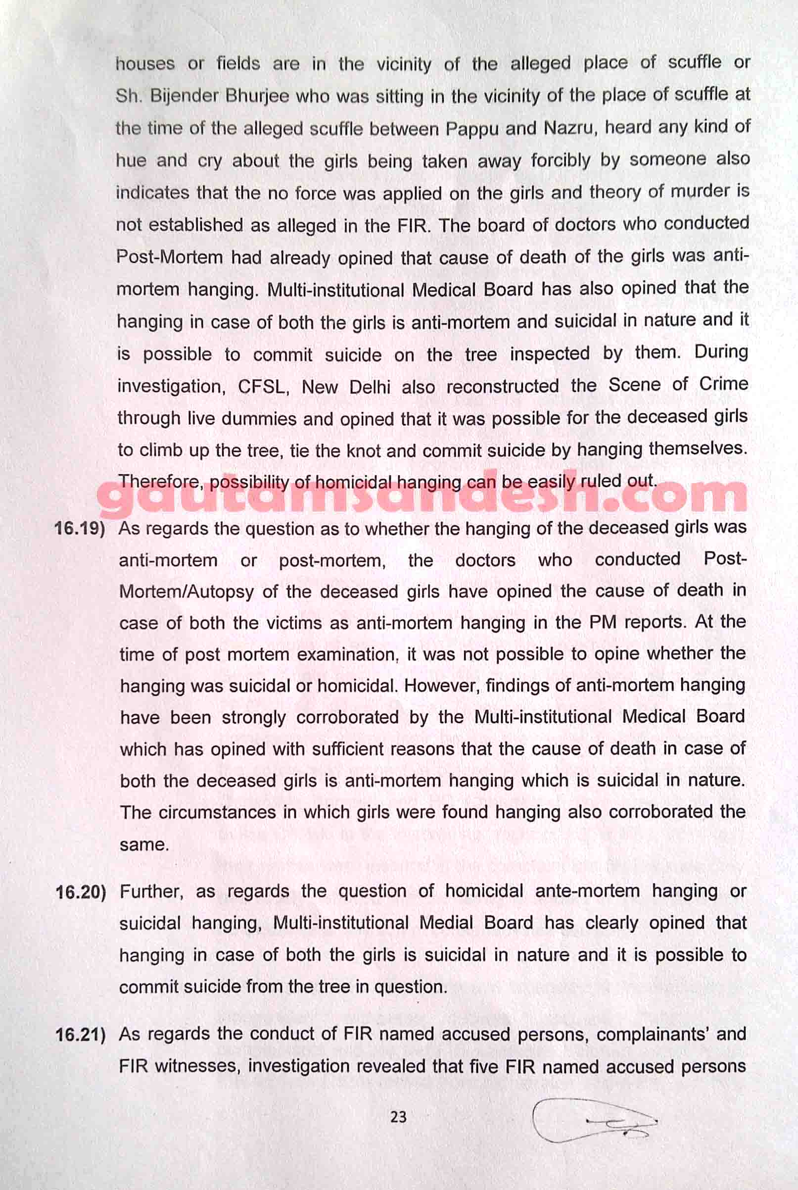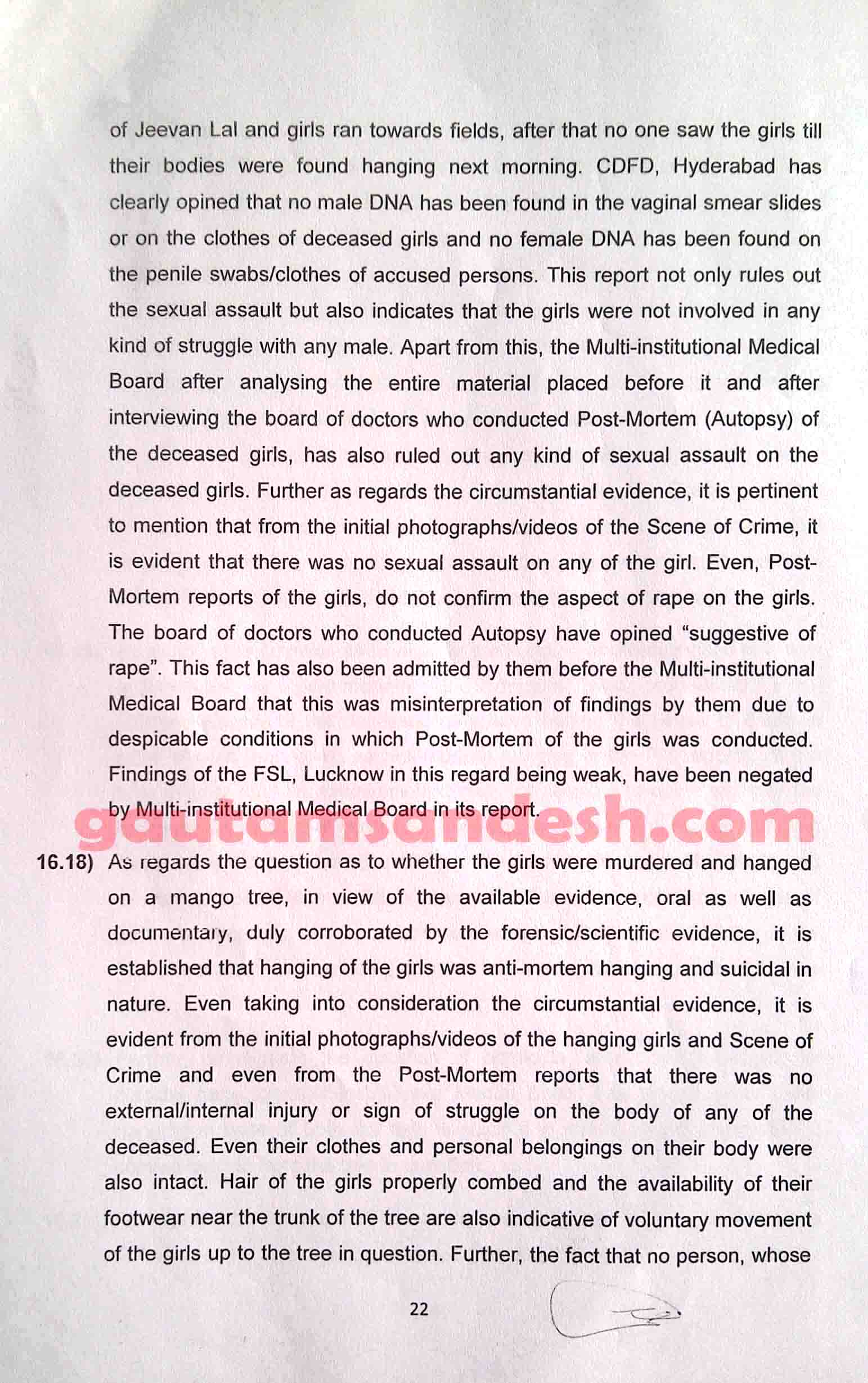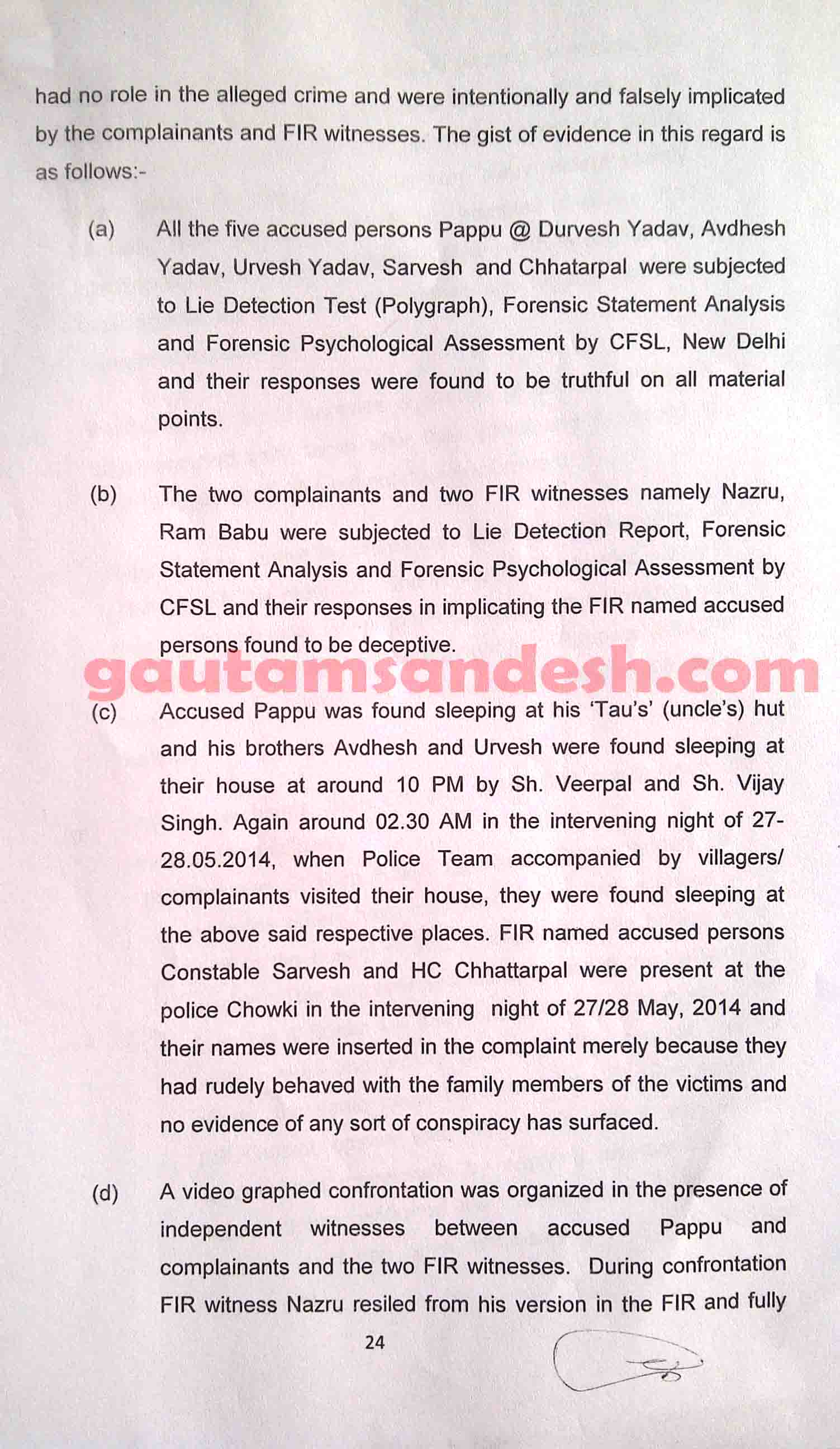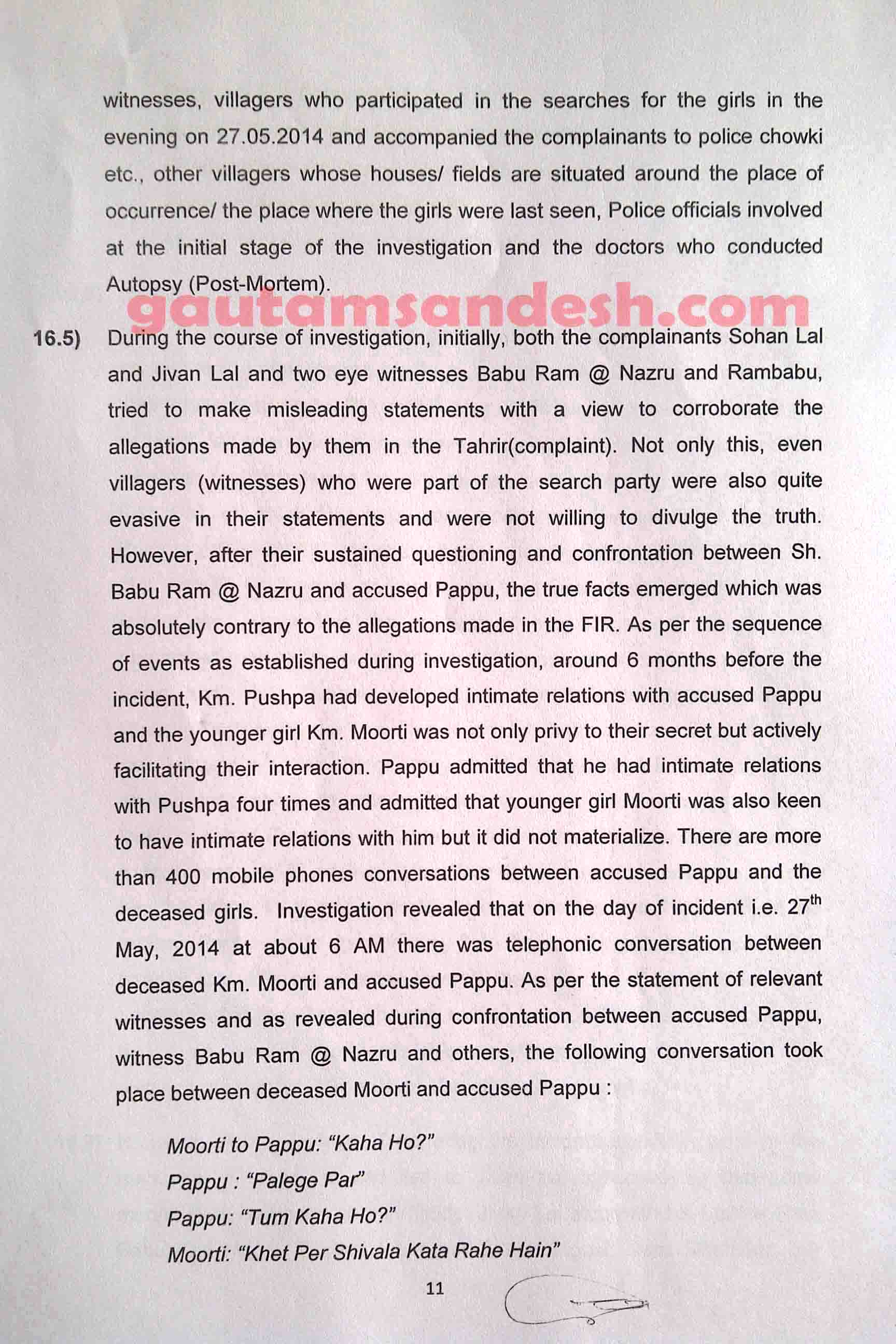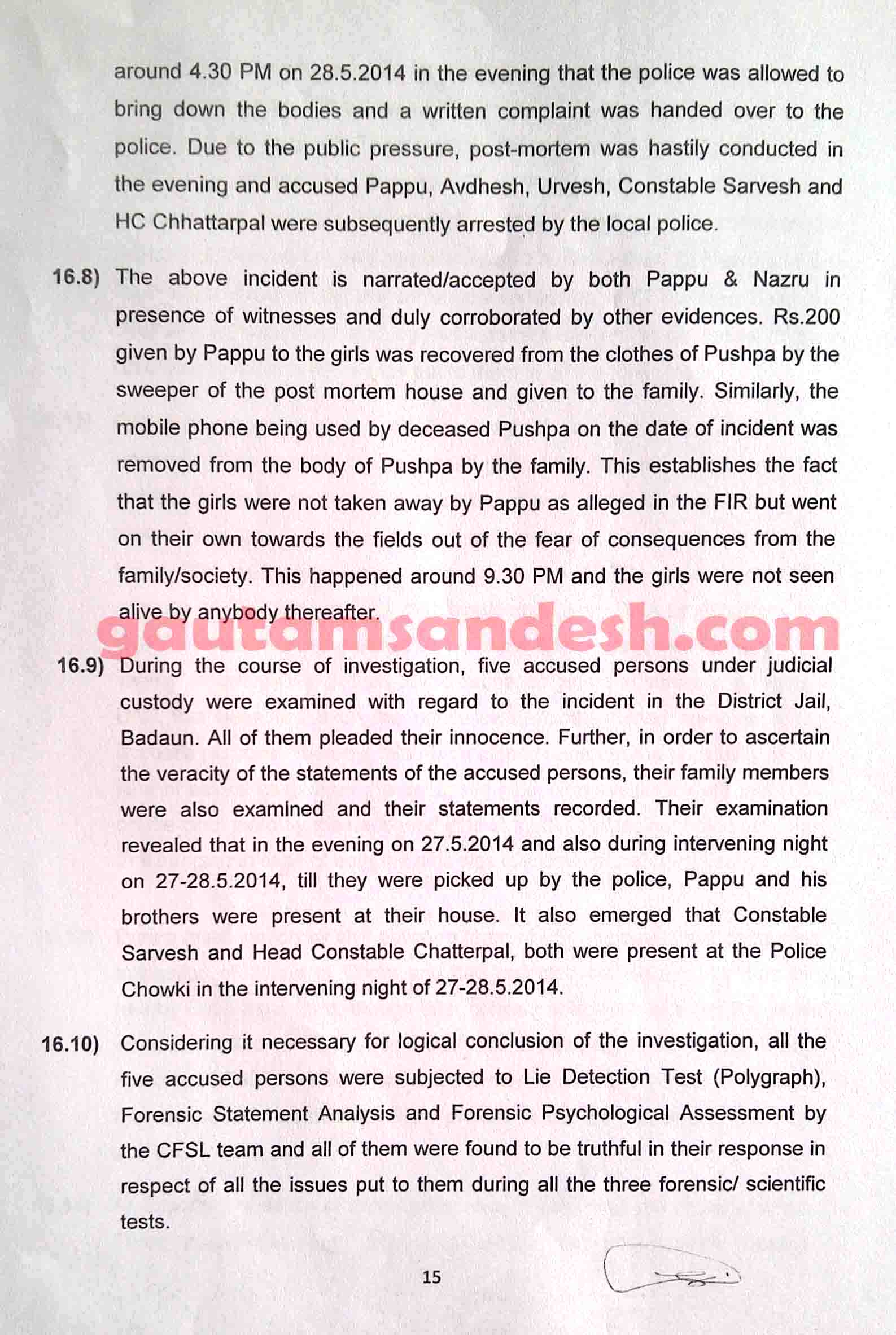 उक्त प्रकरण में तमाम उतार-चढ़ाव के बाद सीबीआई ने 11 दिसंबर 2014 को स्थानीय न्यायालय में अपनी जांच आख्या दाखिल कर दी है, जिस पर न्यायालय ने सुनवाई की तारीख 6 जनवरी 2015 निश्चित की है। मीडिया से मिली जानकारी के आधार पर मृतकाओं के परिजन सीबीआई की जाँच आख्या पर विरोध व्यक्त कर चुके हैं। हालाँकि अभी उन्हें जांच आख्या की प्रति नहीं मिली है। न्यायालय में सीबीआई ने 33 पेज की जाँच आख्या दाखिल की है, जो निम्नलिखित है।