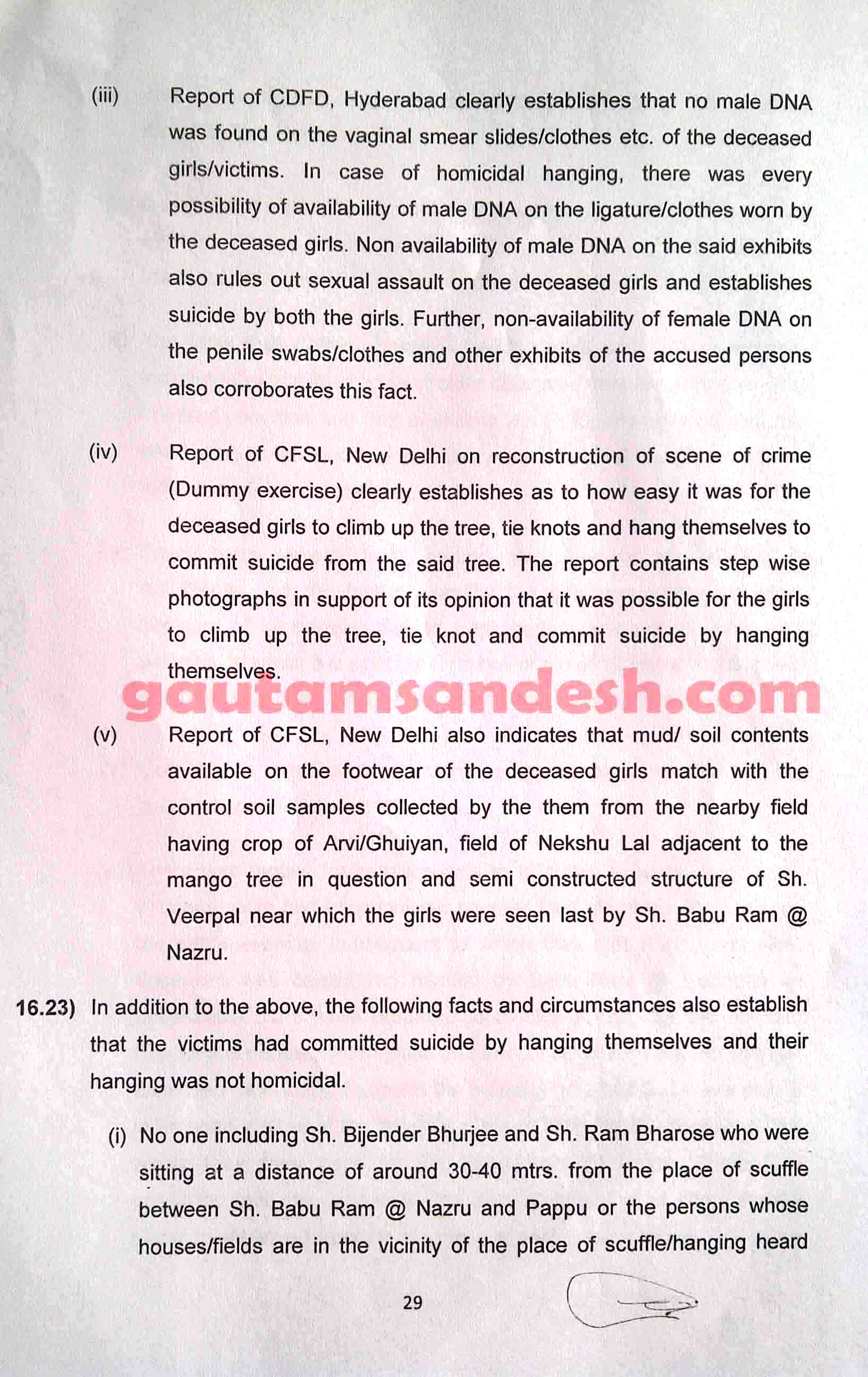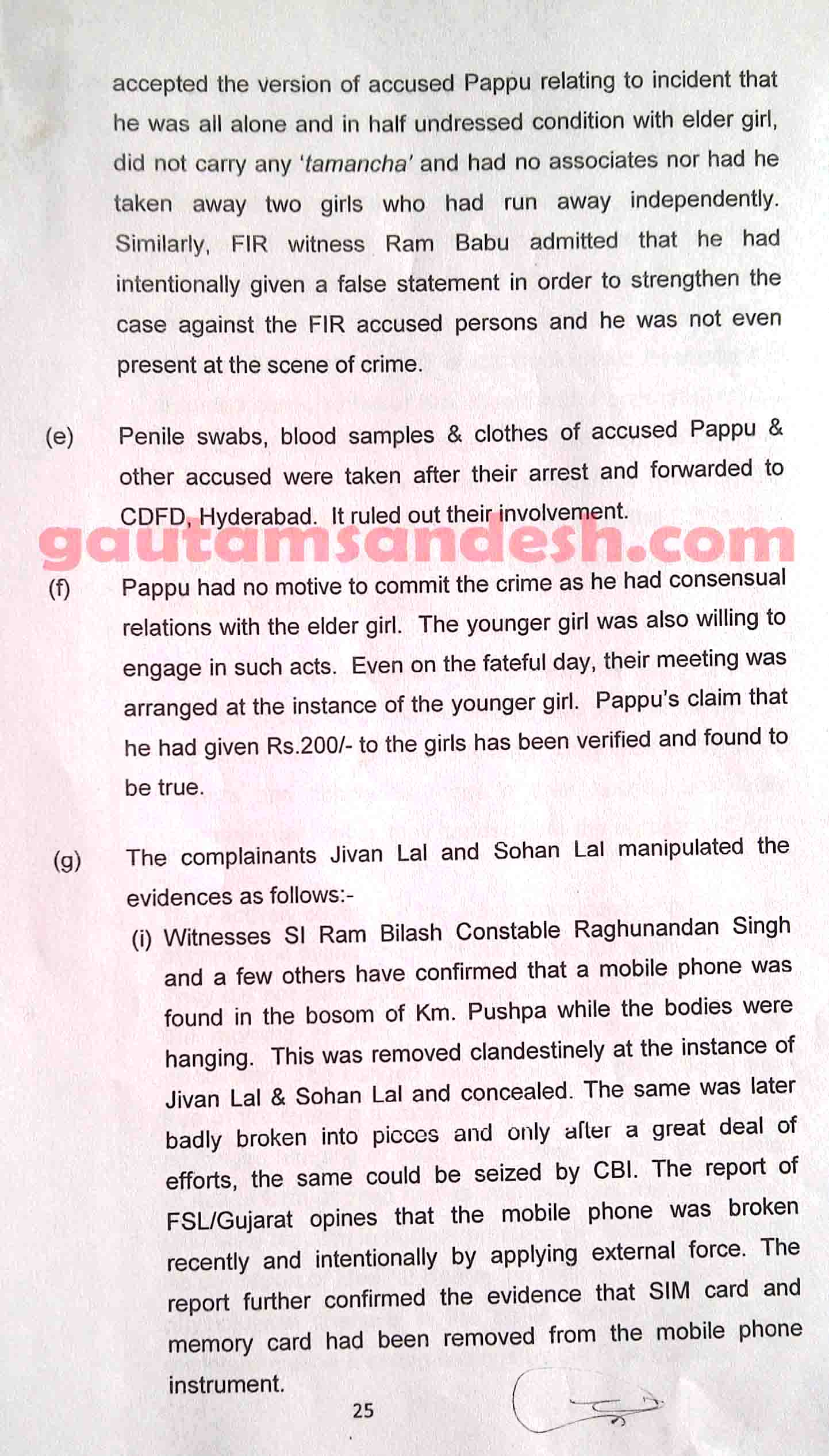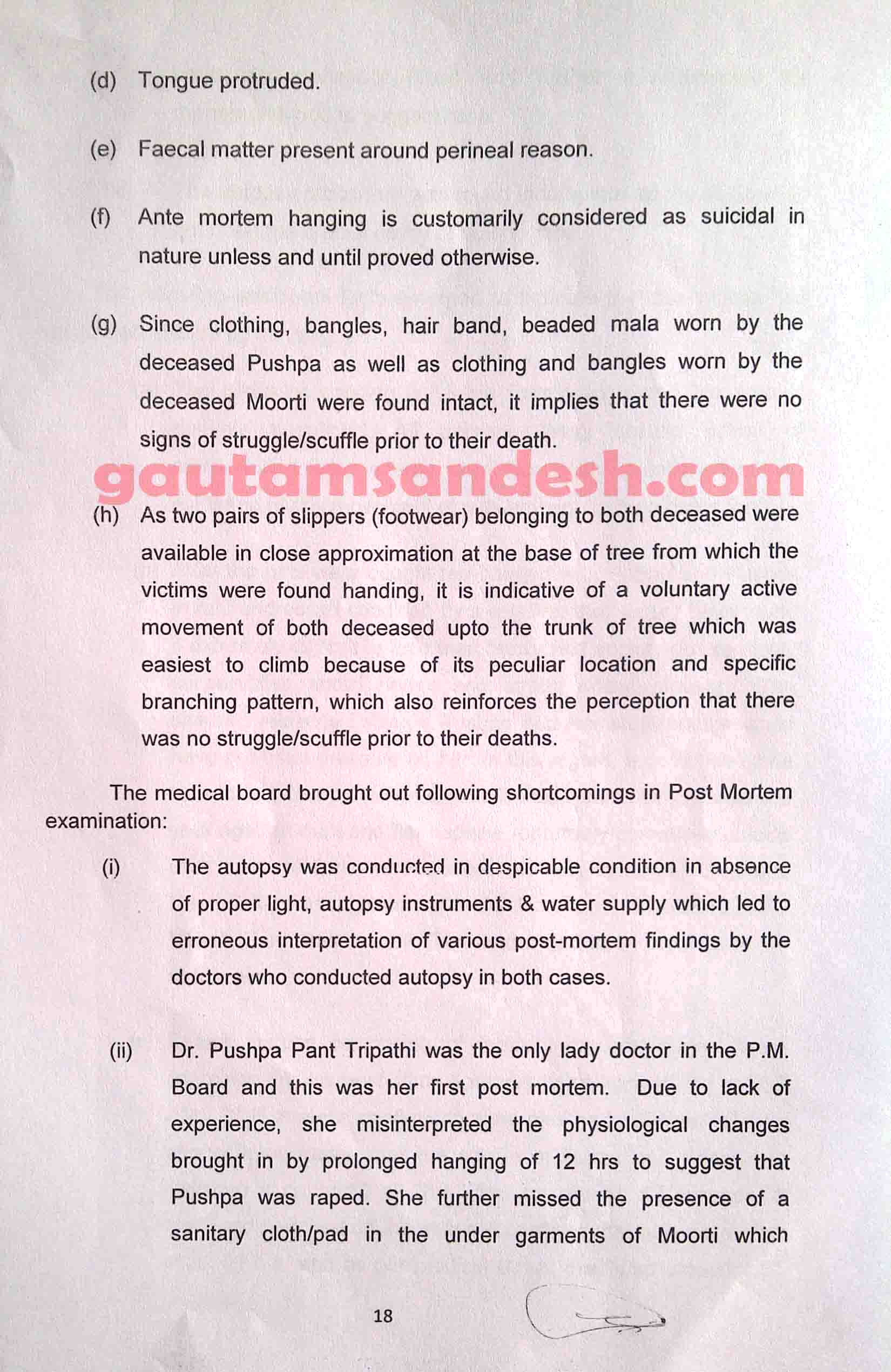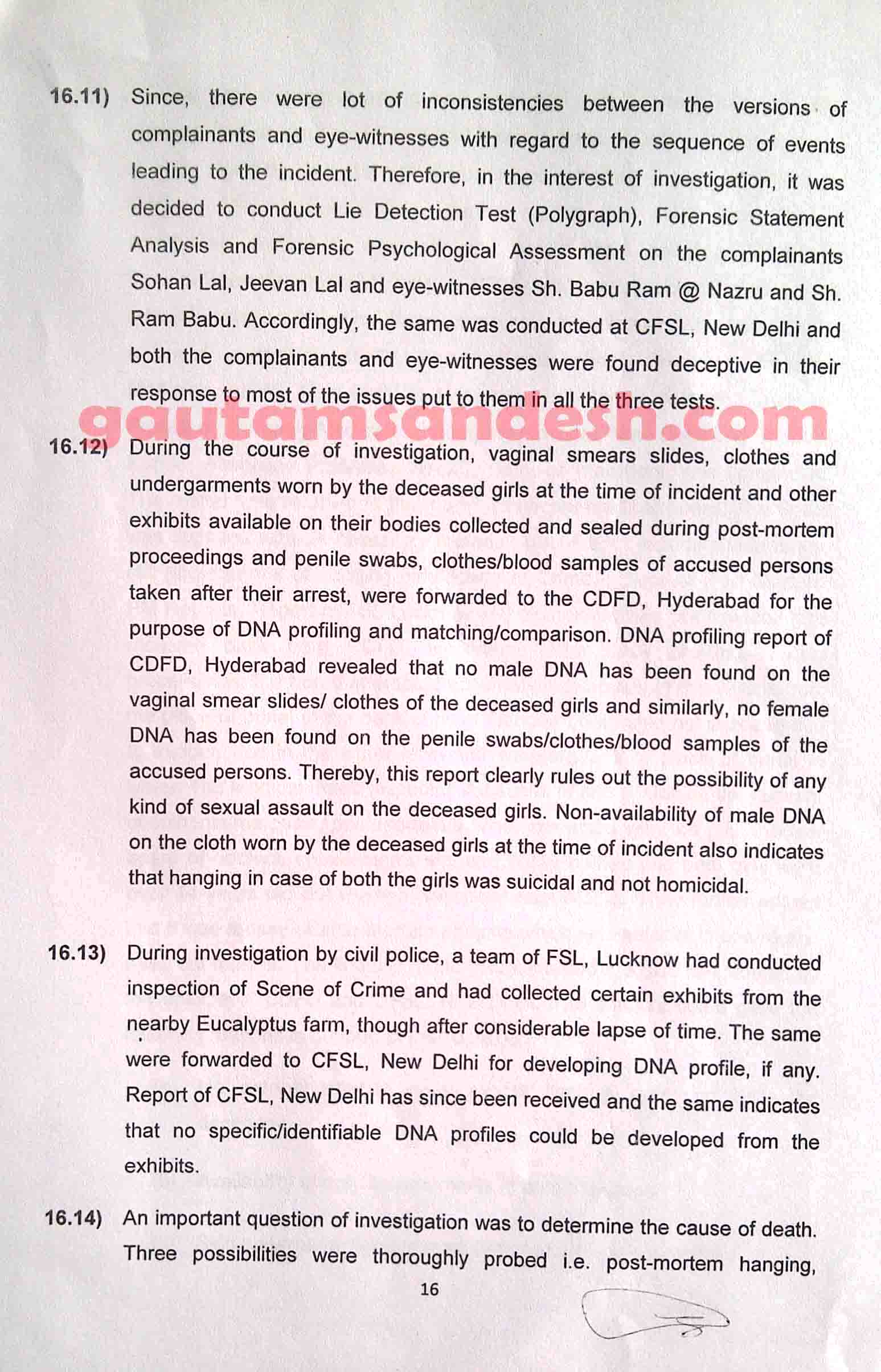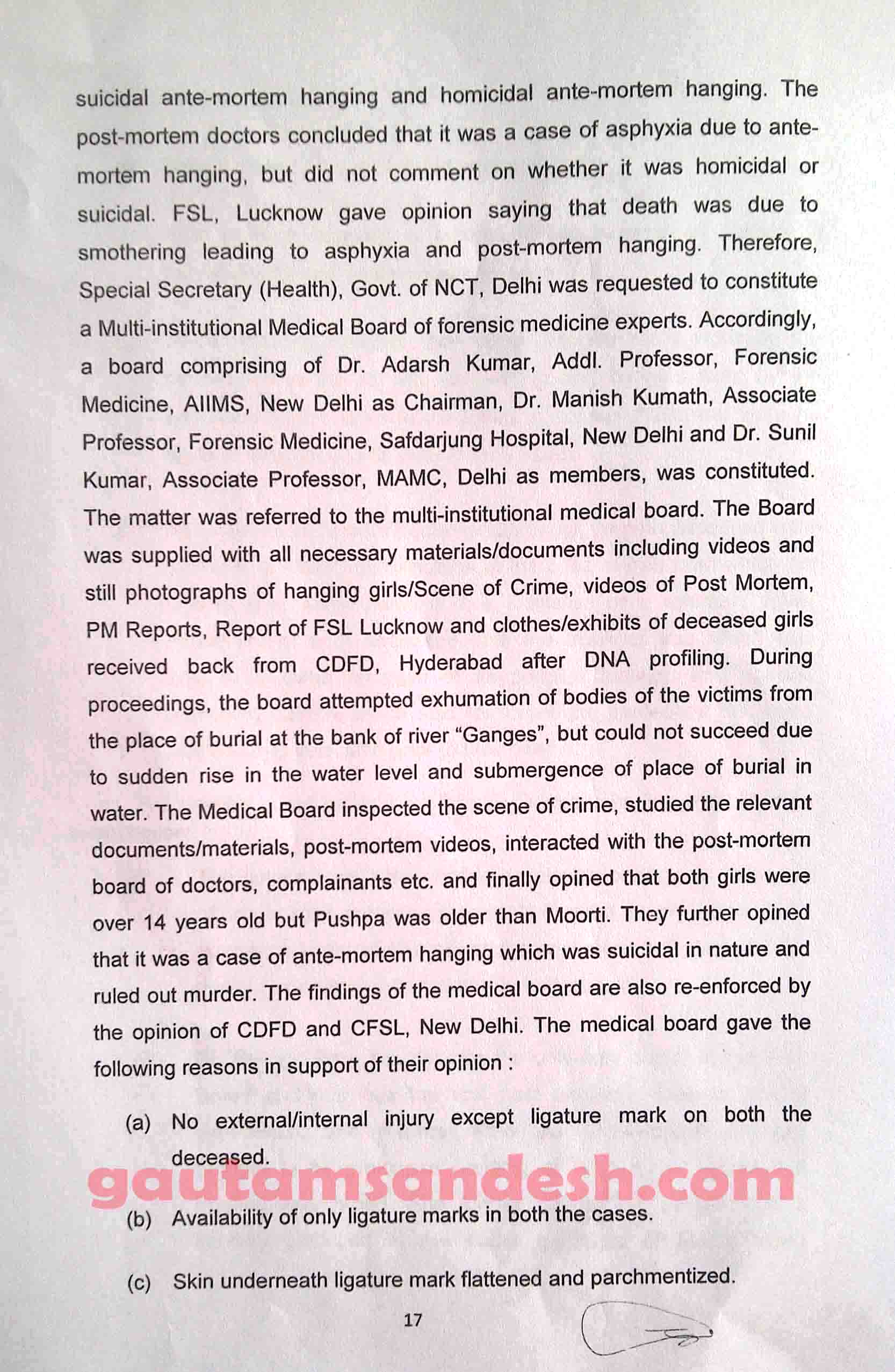उक्त प्रकरण में तमाम उतार-चढ़ाव के बाद सीबीआई ने 11 दिसंबर 2014 को स्थानीय न्यायालय में अपनी जांच आख्या दाखिल कर दी है, जिस पर न्यायालय ने सुनवाई की तारीख 6 जनवरी 2015 निश्चित की है। मीडिया से मिली जानकारी के आधार पर मृतकाओं के परिजन सीबीआई की जाँच आख्या पर विरोध व्यक्त कर चुके हैं। हालाँकि अभी उन्हें जांच आख्या की प्रति नहीं मिली है। न्यायालय में सीबीआई ने 33 पेज की जाँच आख्या दाखिल की है, जो निम्नलिखित है।