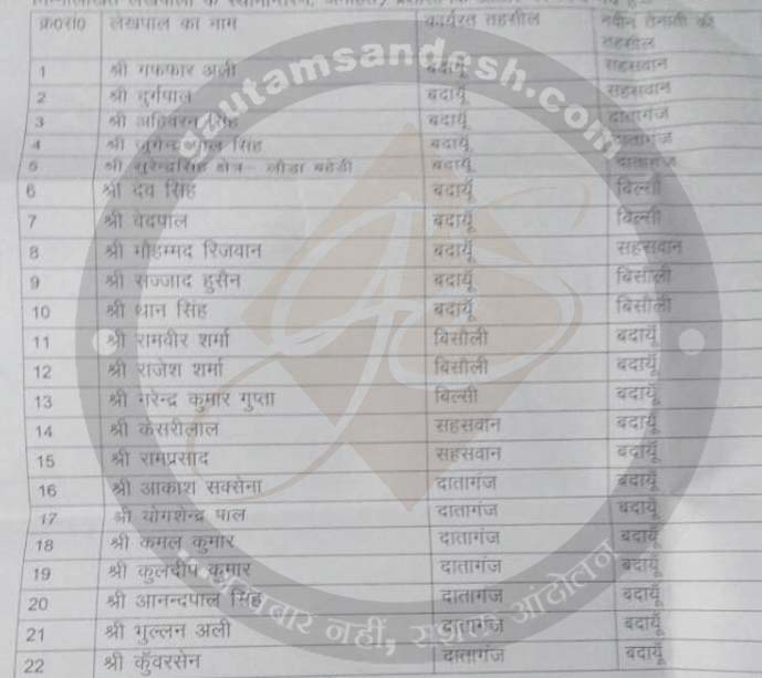 इसके अलावा अपर जिलाधिकारी (प्रशासन) ने बदायूं से थान सिंह को बिसौली, रिजवान, गफ्फार अली और दुर्गपाल को सहसवान, अहिवरन सिंह, जुगेन्द्र पाल सिंह और सुरेन्द्र सिंह को दातागंज, देव सिंह और वेदपाल को बिल्सी तहसील में तैनात किया है। बिसौली से राजेश शर्मा, रामवीर शर्मा और बिल्सी से नरेंद्र कुमार गुप्ता को बदायूं भेजा गया है। केसरी लाल, रामप्रसाद को सहसवान से और आकाश सक्सेना, योगशेन्द्र पाल, कमल कुमार, कुलदीप कुमार, आनंद पाल सिंह, भुल्लन अली और कुंवरसेन को दातागंज तहसील से बदायूं तहसील में तैनात किया गया है। सूत्रों का कहना है कि अभी कई ऐसे लेखपाल हैं, जो बेहद भ्रष्ट और चर्चित हैं, उन्हें भी हटाया जायेगा।