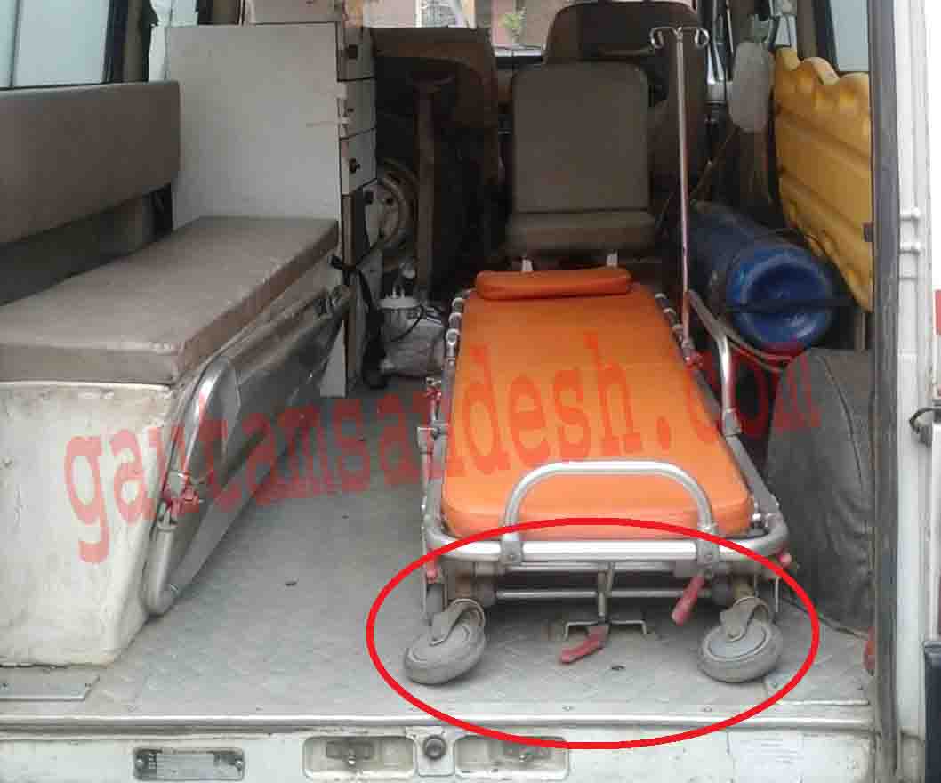 एंबुलेंस के अंदर लाल घेरे में स्ट्रेचर के टूटे पहिये।