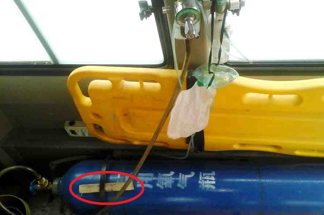 एंबुलेंस के अंदर लाल घेरे में लकड़ी की धांस लगा कर रोका गया ऑक्सीजन सिलेंडर।