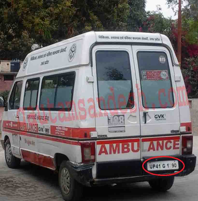 एंबुलेंस के अग्र भाग का लाल घेरे में अस्पष्ट नंबर।