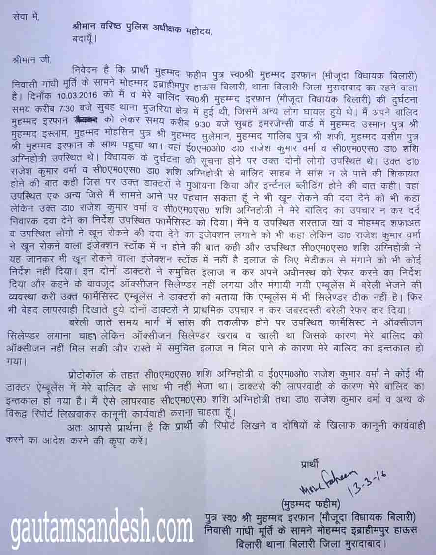 दिवंगत विधायक के बेटे फहीम द्वारा सीएमएस व डॉक्टर के विरुद्ध दी गई तहरीर की छायाप्रतिे।