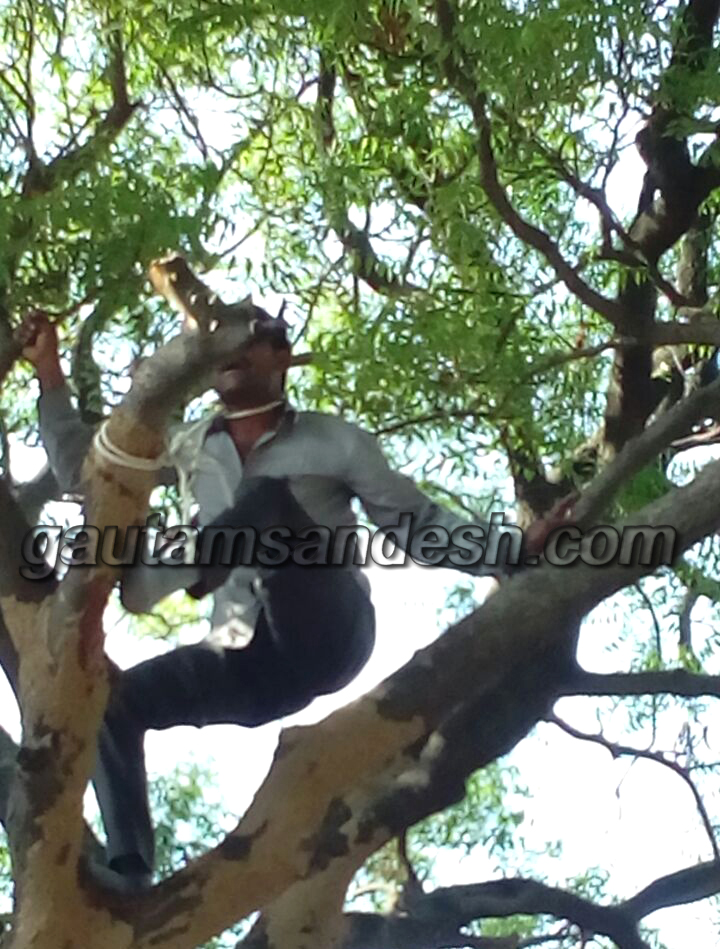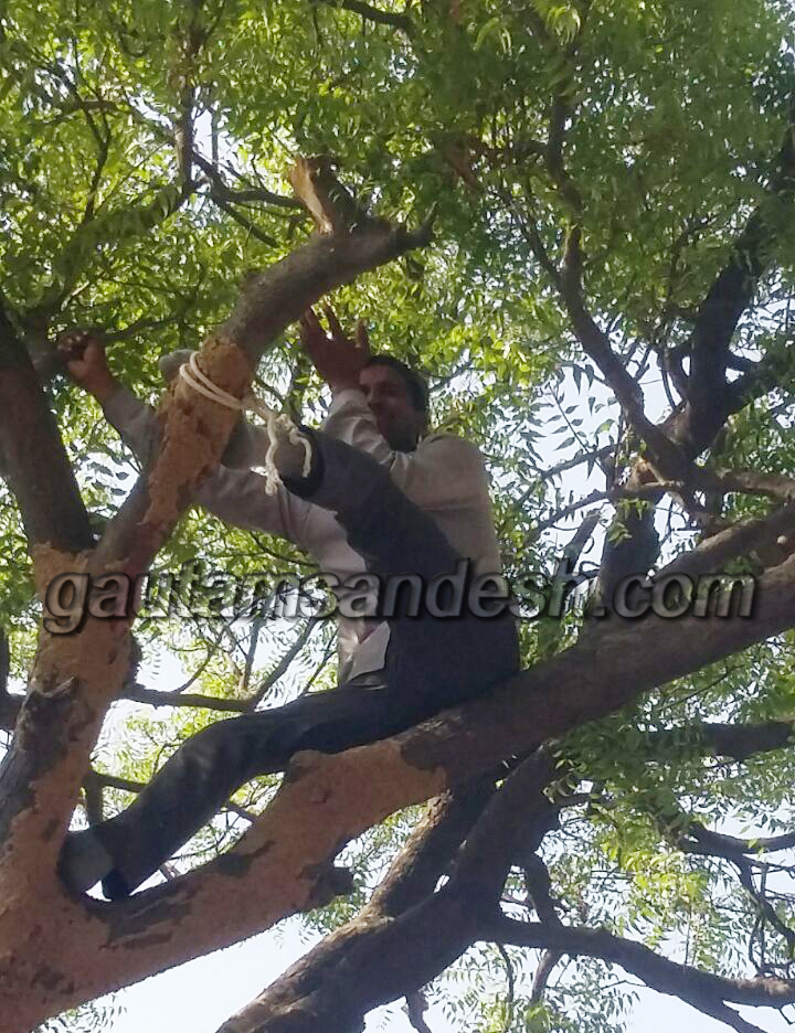 दिल्ली में गजेन्द्र सिंह द्वारा की गई आत्महत्या का हृदय विदारक दृश्य लोगों के दिमाग से अभी तक निकला नहीं है, ठीक वैसा ही दृश्य आज नजर आया। पेड़ पर फांसी लगाने को तत्पर ग्रामीण के आक्रोश ने प्रशासनिक अफसरों की धड़कनें रोक दीं। ग्रामीण बमुश्किल पेड़ से नीचे उतरा, तब अफसरों को राहत मिली। घटना के समय बड़ी संख्या में लोग मौके पर पहुंच गये, जिससे घटना चर्चा का विषय बन गई है।